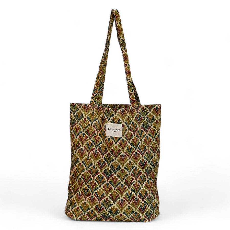 Bolsa “tote bag” con asas para llevar al hombro. Con tejido fino con estampado geométrico en tonos beige y verde. Para su correcto mantenimiento se aconseja lavarlo en frío y no utilizar secadora.