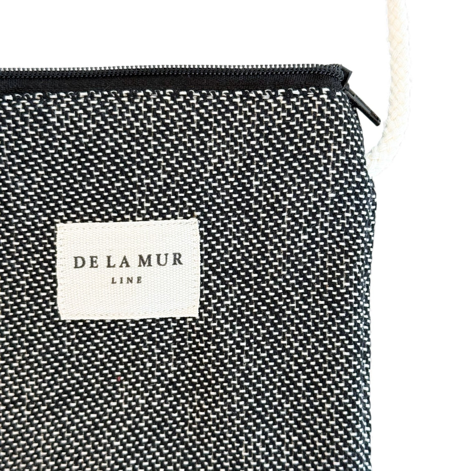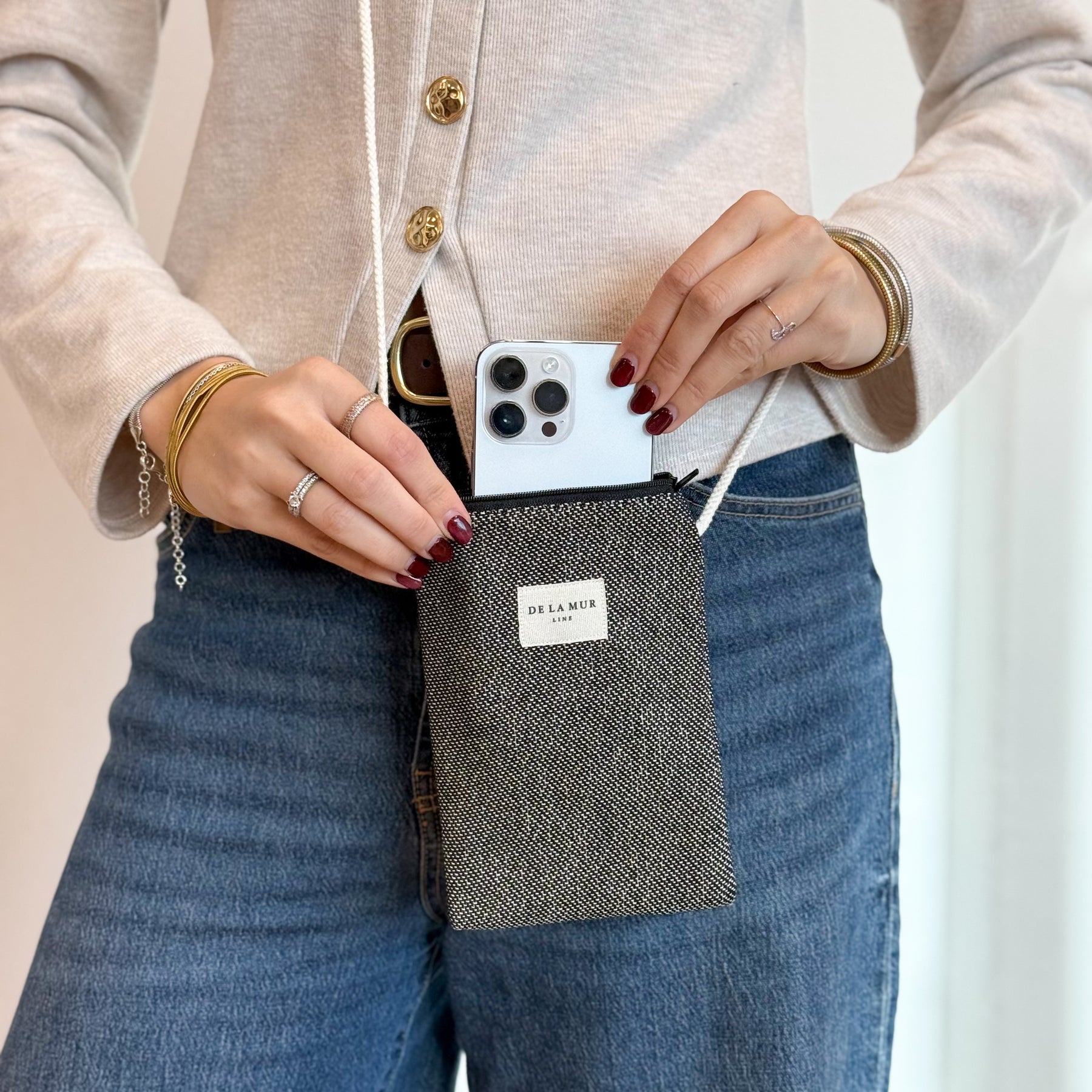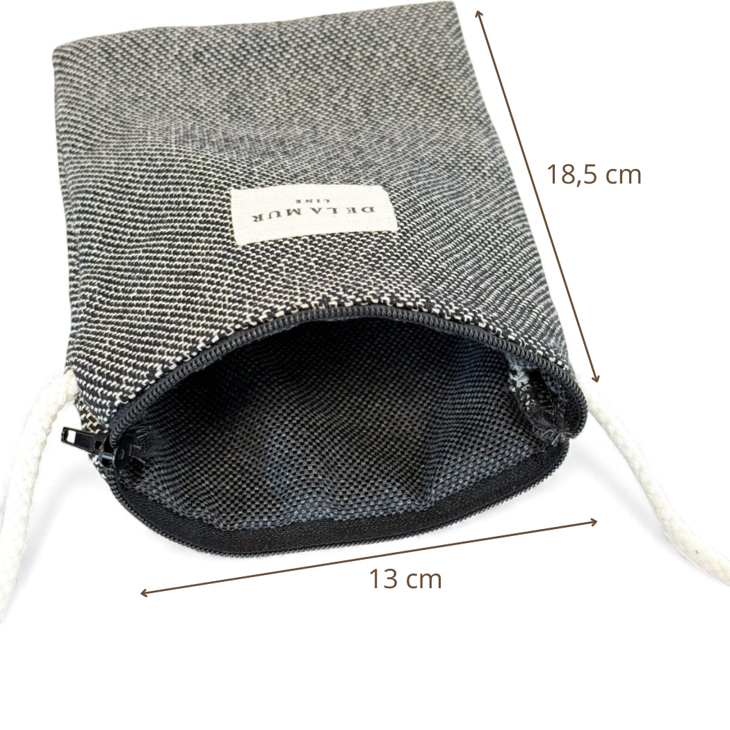 Bolsito porta móvil para llevar tipo bandolera. Con cremallera en la parte superior y cordón largo de algodón de color crudo. Con tejido grueso de jacquard 80% algodón y 20% poliéster de color negro/gris oscuro liso. Cada articulo puede tener una variación en el estampado, dependiendo de donde se haya efectuado el corte de la pieza. Forrado de tejido grueso de color gris en la parte interior. Para su correcto mantenimiento se aconseja lavarlo en frío y no utilizar secadora.