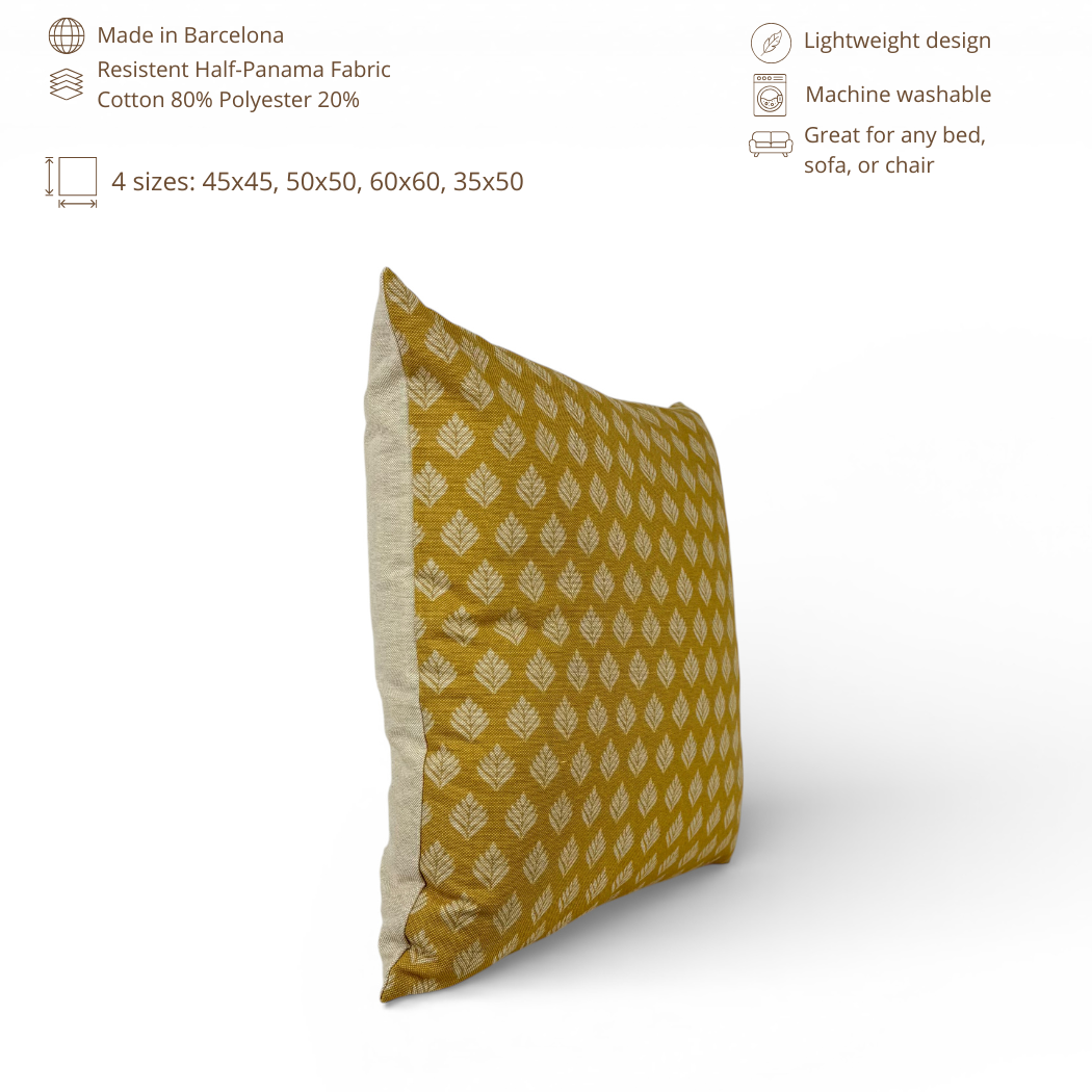 Funda de cojín sin relleno confeccionada en tejido fino de half-panama 80% algodón y 20% poliéster de gran calidad, con un elegante estampado floral mostaza por un lado y beige liso por el otro. Aporta textura y calidez a cualquier espacio. Su tejido resistente la convierte en una pieza decorativa duradera y atemporal.