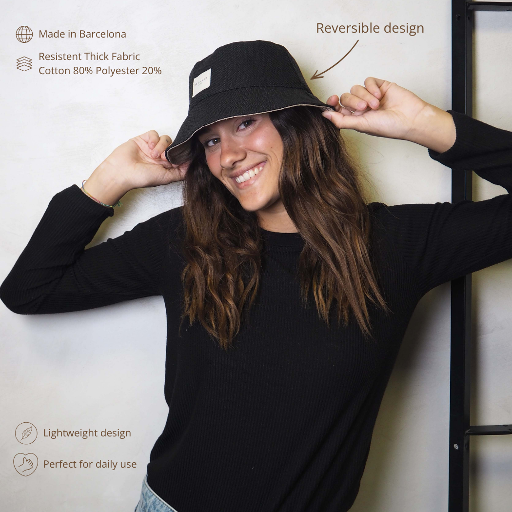 Gorro tipo “Bucket Hat” con tejido grueso de color negro y forro de tela estampada en la parte interior. Reversible. Talla única. Para su correcto mantenimiento se aconseja lavarlo en frío y no utilizar secadora.