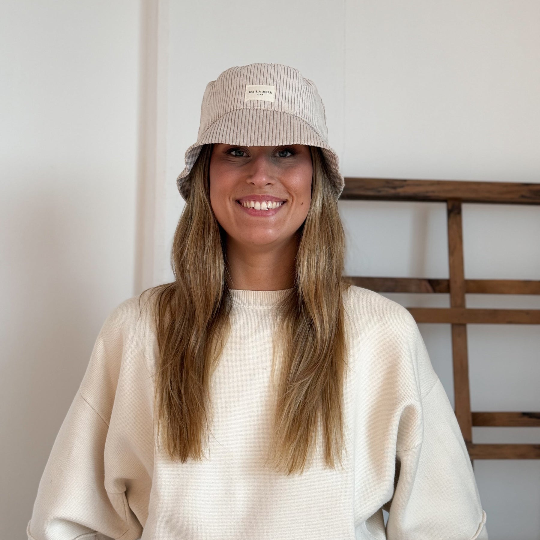 Gorro tipo "Bucket Hat" con tejido grueso de pana beige y forro de tela estampada en la parte interior. Reversible. Talla única. Para su correcto mantenimiento se aconseja lavarlo en frío y no utilizar secadora.