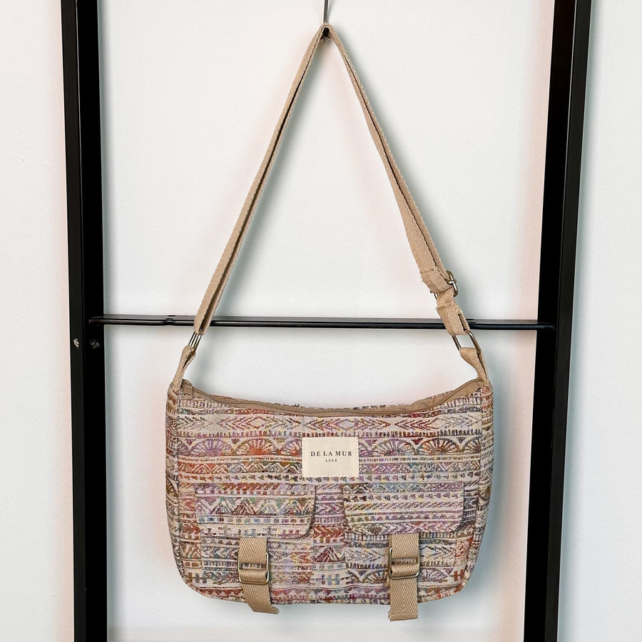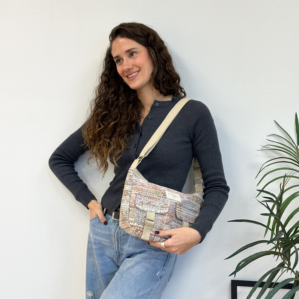 Bolso bolsillos solapa tipo bandolera con asa larga ajustable de cinta de espiga de algodón de color beige. Con tejido con estampado étnico multicolor. Cierre superior con cremallera. Dos bolsillos delanteros con solapa cerrados con cinta y hebilla. Forrado de tejido grueso de color gris en la parte interior. Bolsillo interior con cremallera. Para su correcto mantenimiento se aconseja lavarlo en frío a mano y no utilizar secadora.