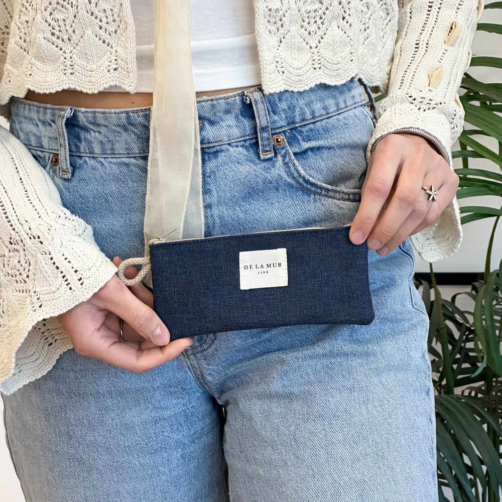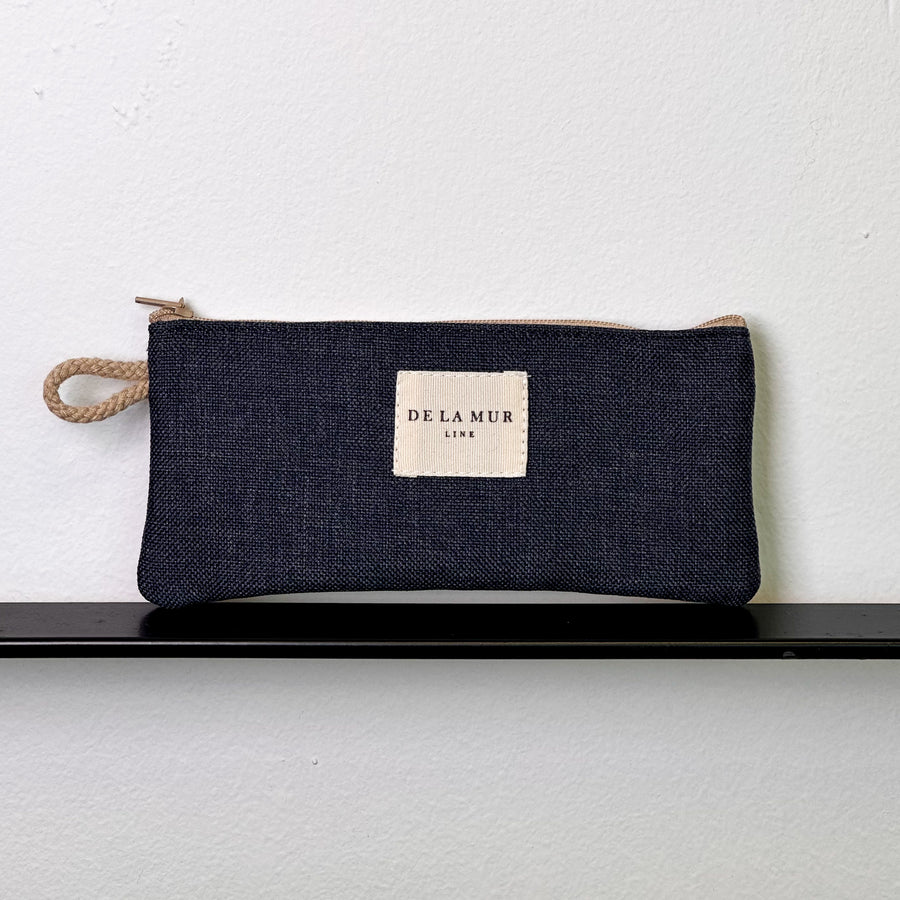 Funda de gafas con cremallera en la parte superior y pequeña asa de cordón de color beige en el lateral. Con tejido fino liso de color azul marino. Cada articulo puede tener una variación en el estampado, dependiendo de donde se haya efectuado el corte de la pieza. Forrado de tejido grueso de color gris en la parte interior. Para su correcto mantenimiento se aconseja lavarlo en frío a mano y no utilizar secadora.
