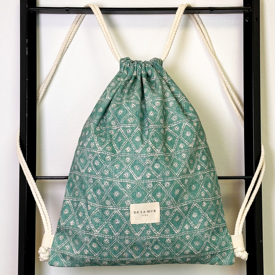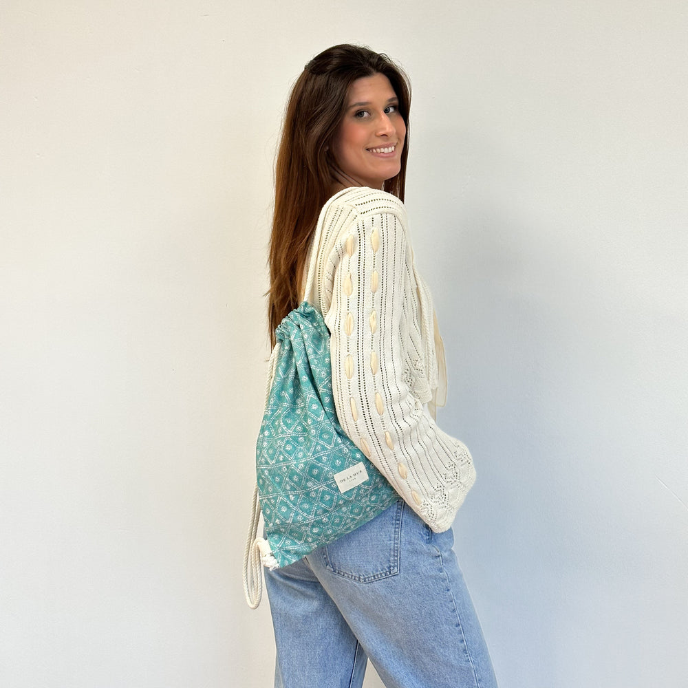 Mochila con cordón ajustable de color crudo y con un tejido con estampado geométrico en color verde agua marina. Para su correcto mantenimiento se aconseja lavarlo en frío a mano y no utilizar secadora.
