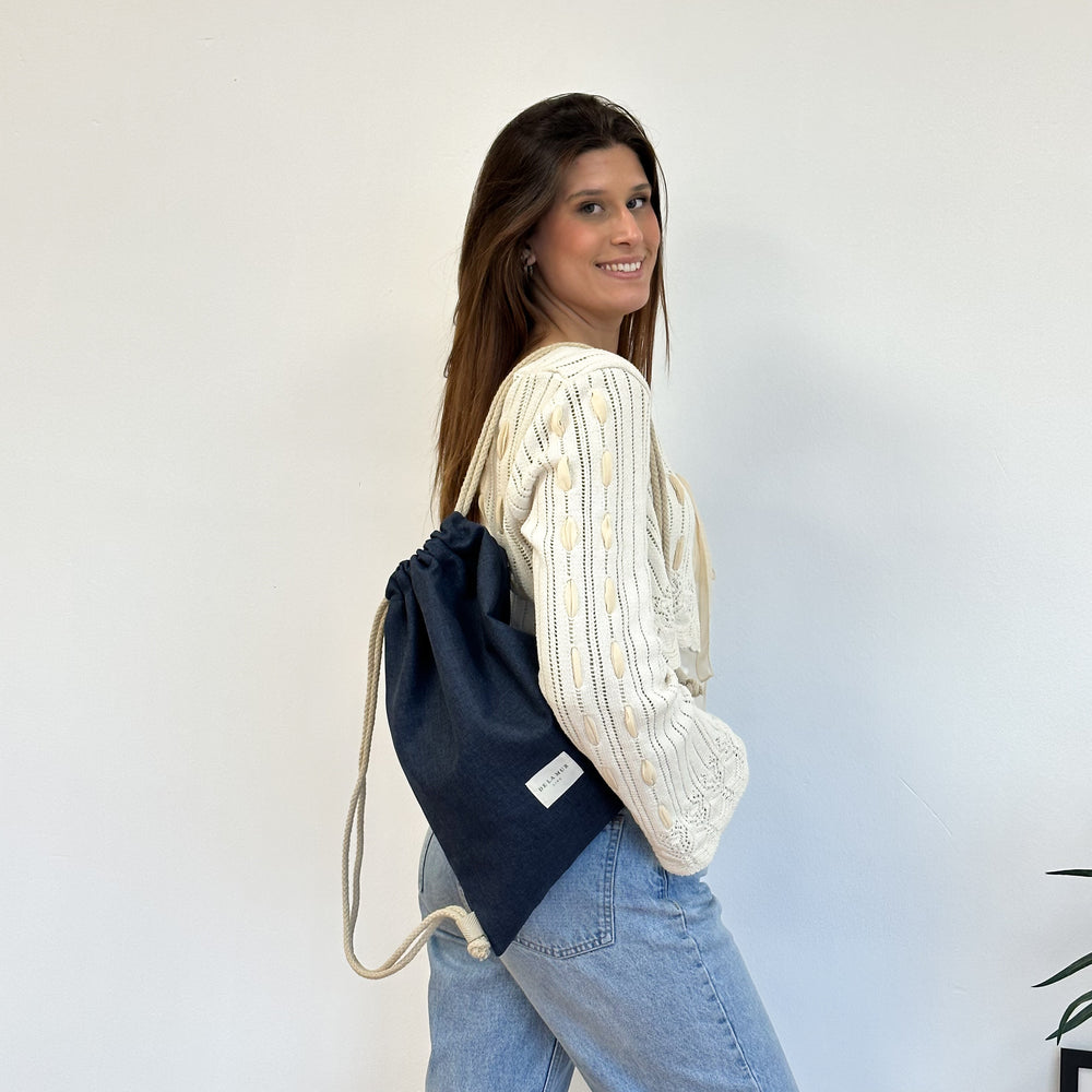 Mochila con cordón ajustable de color beige y con tejido fino liso de color azul marino. Para su correcto mantenimiento se aconseja lavarlo en frío a mano y no utilizar secadora.