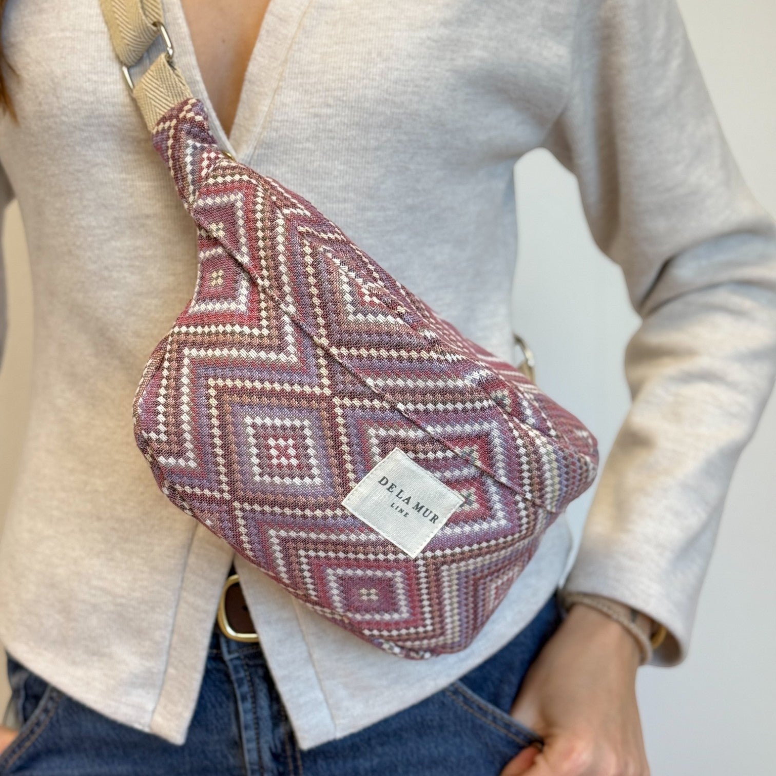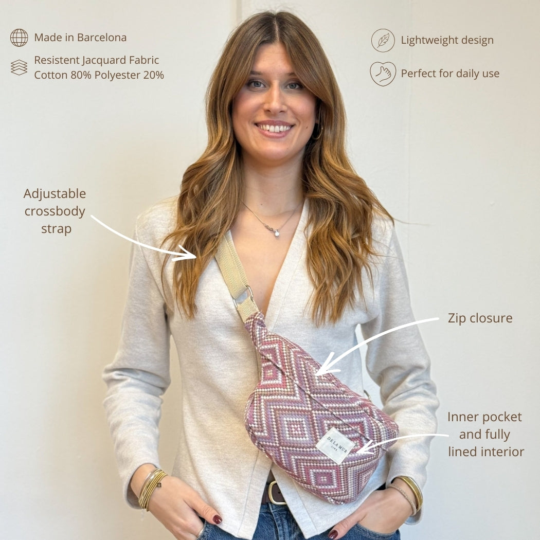 Bolso riñonera tipo bandolera con asa larga ajustable de cinta de espiga de algodón de color beige. Con un tejido grueso de jacquard 80% algodón y 20% poliéster con estampado geométrico en tonos rosados y lilas. Cierre superior con cremallera. Con bolsillo interior. Forrado de tejido grueso de color gris en la parte interior. Para su correcto mantenimiento se aconseja lavarlo en frío a mano y no utilizar secadora.