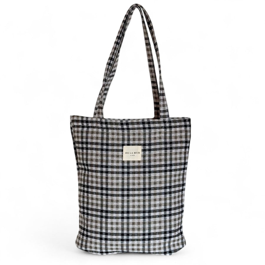 Bolsa "tote bag" con asas para llevar al hombro. Con tejido grueso de jacquard con estampado a cuadros en tonos negro y beige. Para su correcto mantenimiento se aconseja lavarlo en frío y no utilizar secadora.