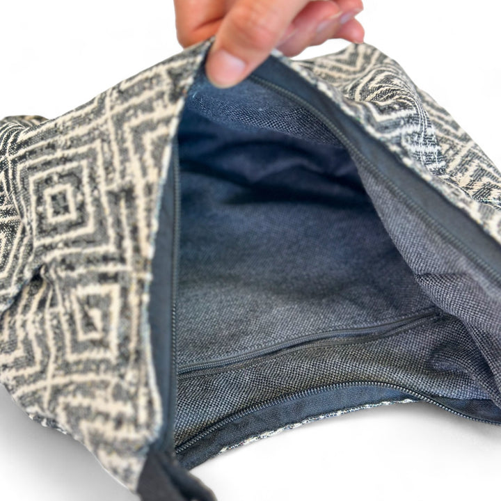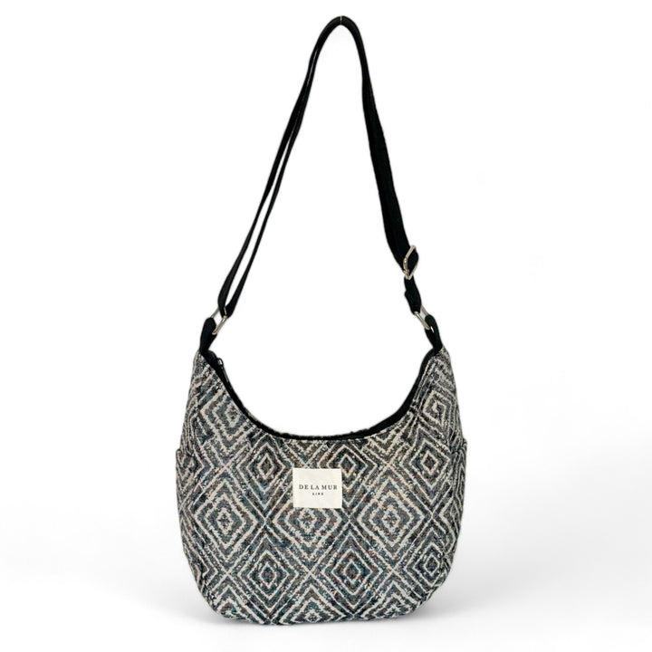 Bolso luna tipo bandolera con asa larga ajustable de cinta de espiga de algodón de color negro. Cierre superior con cremallera. Bolsillos laterales sin cremallera. Con tejido grueso de jacquard con estampado geométrico en tonos gris oscuro. Forrado de tejido grueso de color gris en la parte interior. Bolsillo interior con cremallera. Para su correcto mantenimiento se aconseja lavarlo en frío a mano y no utilizar secadora.