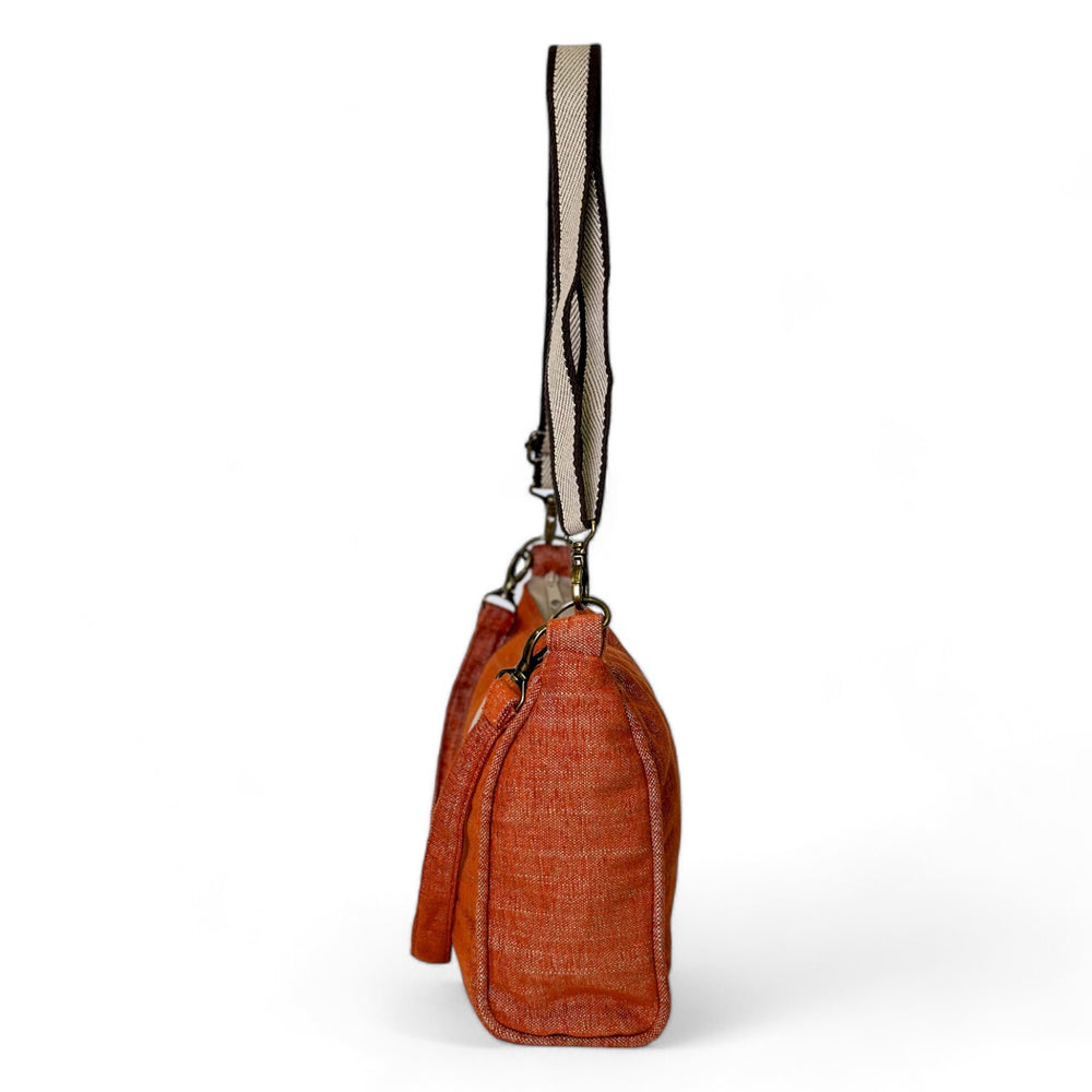 Bolso mediano con asa larga ajustable y un asa corta de tejido. Con un tejido liso efecto desgastado de color teja. Opción de llevarlo al hombro o como bandolera. Bolsillo interior con cremallera y bolsillo exterior grande con cremallera. Asa de cinta de espiga de algodón de color beige con lurex con marrón en los laterales. Etiqueta de marca de polipiel. Para su correcto mantenimiento se aconseja lavarlo en frío y no utilizar secadora.