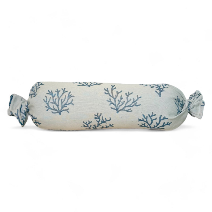 Cojín caramelo con relleno. Con tejido grueso de jacquard con estampado de coral de color azul sobre fondo crudo. Para su correcto mantenimiento se aconseja lavarlo en frío y no utilizar secadora.