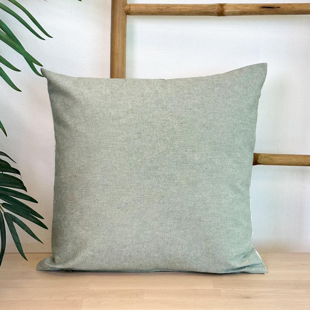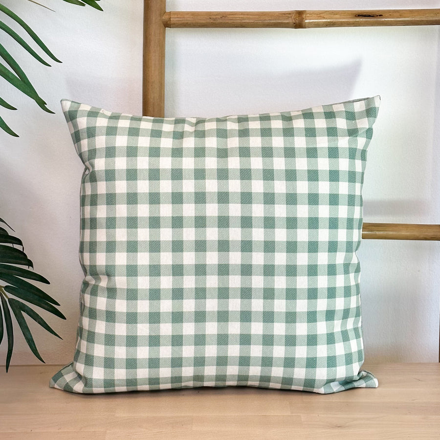 Funda de cojín sin relleno. Combinado con dos tejidos diferentes, un tejido con estampado a cuadros vichy en tono verde por una cara, y un tejido liso de color verde por la otra. Para su correcto mantenimiento se aconseja lavarlo en frío y no utilizar secadora.
