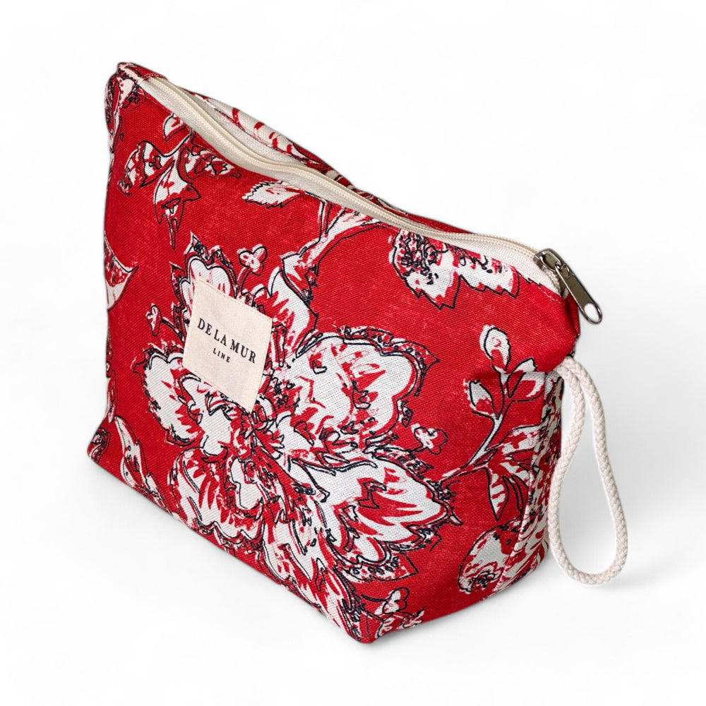 Neceser con cremallera en la parte superior y asa de cordón de color crudo en el lateral. Con tejido fino de half-panama con estampado floral blanco sobre fondo rojo. Forrado de tejido grueso de color gris en la parte interior. Para su correcto mantenimiento se aconseja lavarlo en frío a mano y no utilizar secadora.