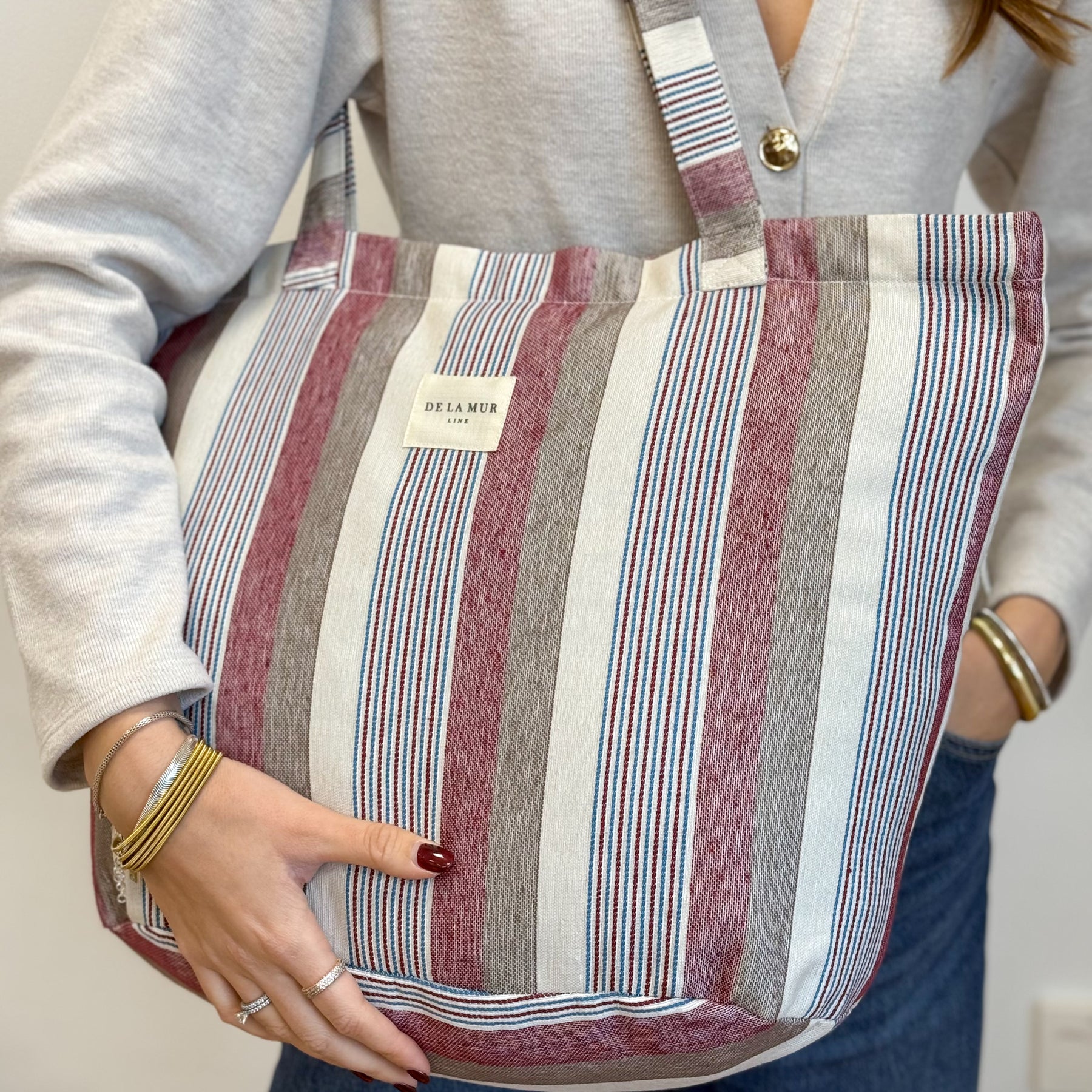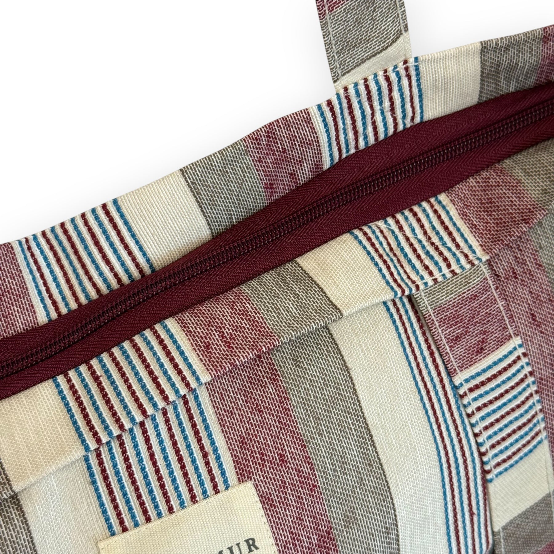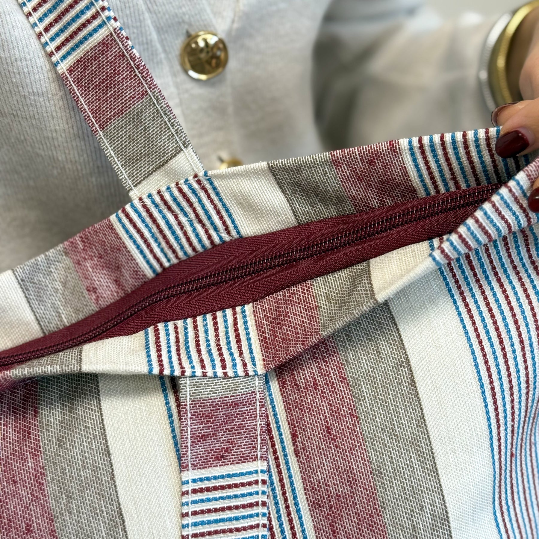 Bolsa shopper grande con asas para llevar al hombro. Con tejido grueso de jacquard 80% algodón y 20% poliéster con estampado a rayas en tonos granate, azul, beig y crudo. Con cremallera en la parte superior. Para su correcto mantenimiento se aconseja lavarlo en frío a mano y no utilizar la secadora.