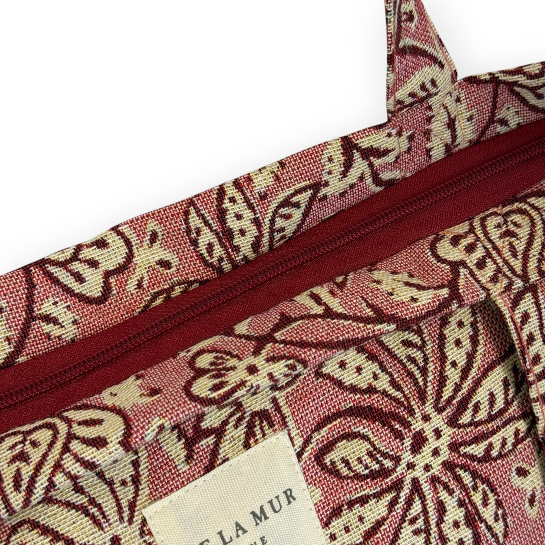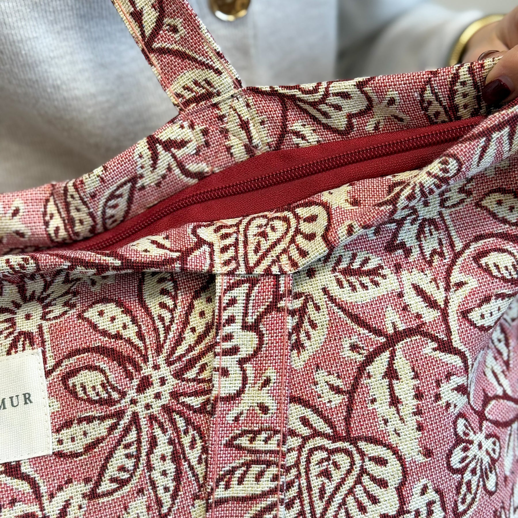 Bolsa shopper grande con asas para llevar al hombro. Con tejido grueso de jacquard 80% algodón y 20% poliéster con estampado floral en tono crudo sobre fondo rosado. Con cremallera en la parte superior. Para su correcto mantenimiento se aconseja lavarlo en frío a mano y no utilizar la secadora.