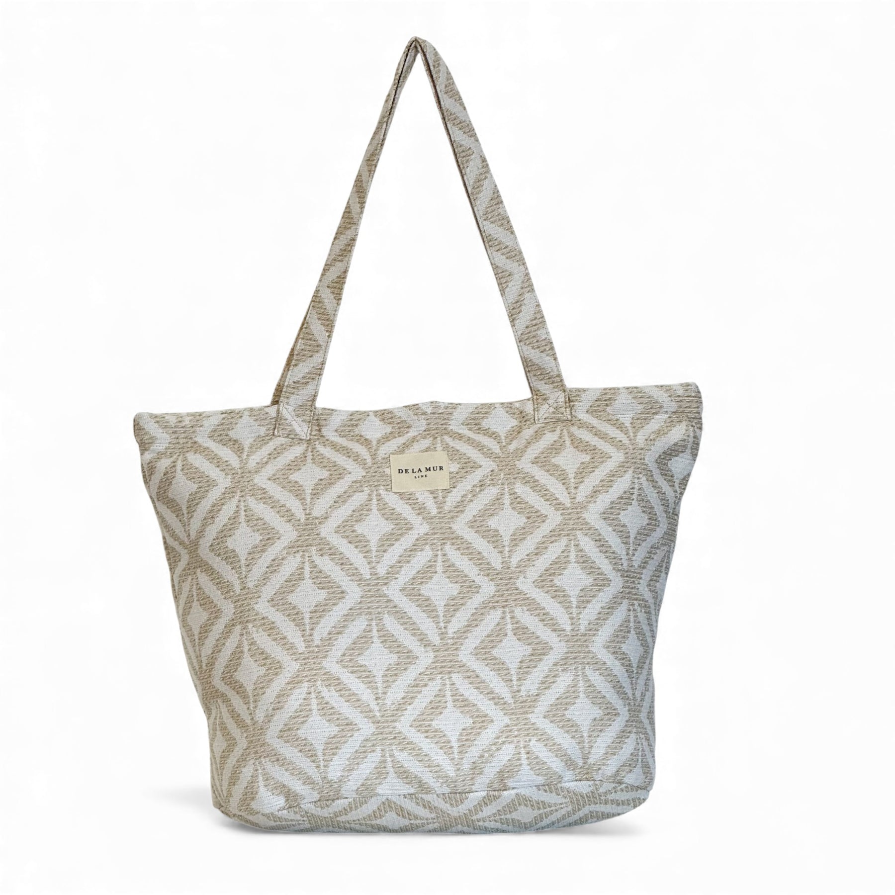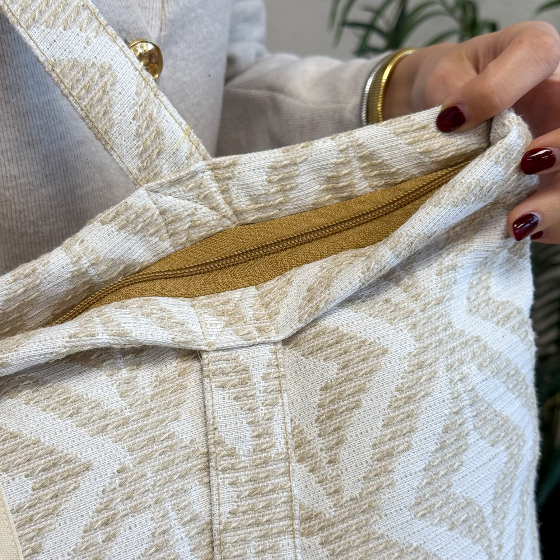Bolsa shopper grande con asas para llevar al hombro. Con tejido grueso de jacquard 80% algodón y 20% poliéster con estampado geométrico en tonos crudo y beige. Con cremallera en la parte superior. Para su correcto mantenimiento se aconseja lavarlo en frío a mano y no utilizar la secadora.