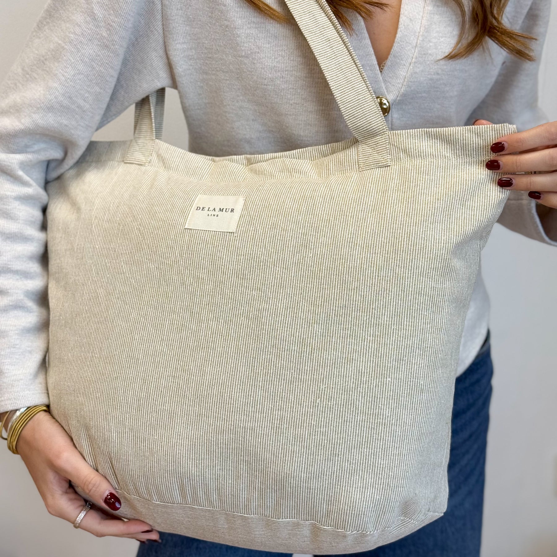 Bolsa shopper grande con asas para llevar al hombro. Con tejido fino con relieve 80% algodón y 20% poliéster con estampado a rayas en tono mostaza. Con cremallera en la parte superior. Para su correcto mantenimiento se aconseja lavarlo en frío a mano y no utilizar la secadora.