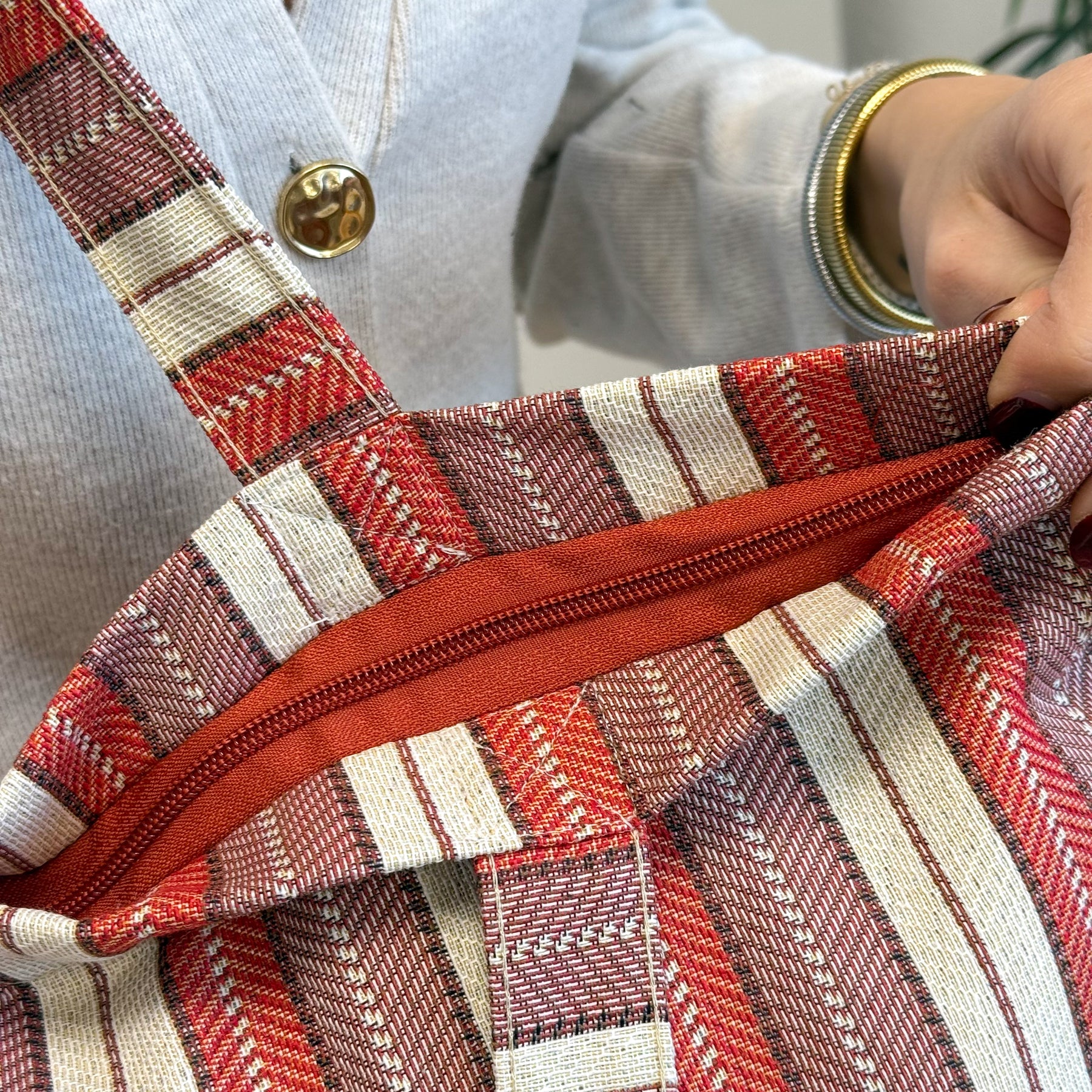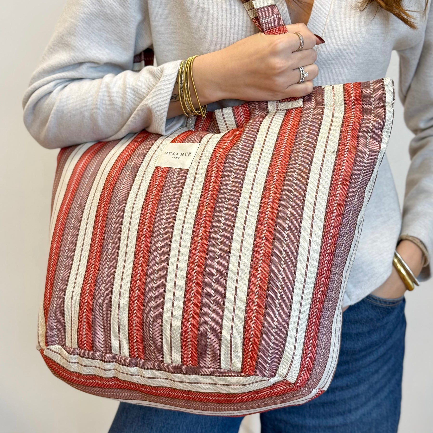 Bolsa shopper grande con asas para llevar al hombro. Con tejido grueso de jacquard 80% algodón y 20% poliéster con estampado a rayas en tonos rojos, lilas y crudos. Con cremallera en la parte superior. Para su correcto mantenimiento se aconseja lavarlo en frío a mano y no utilizar la secadora.