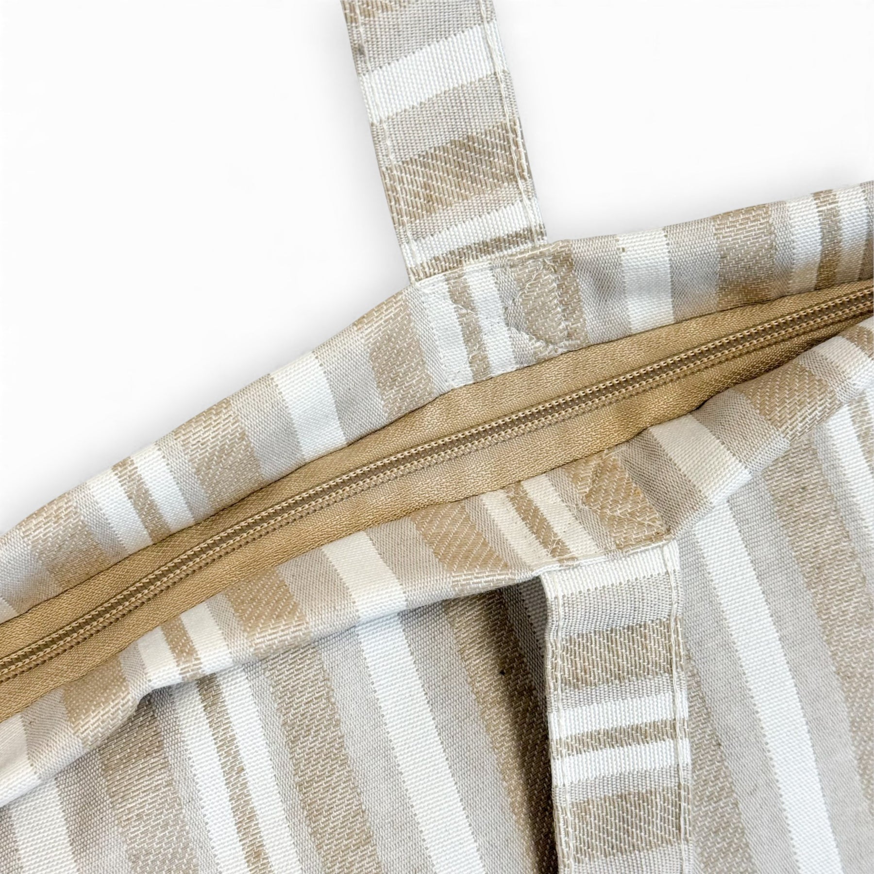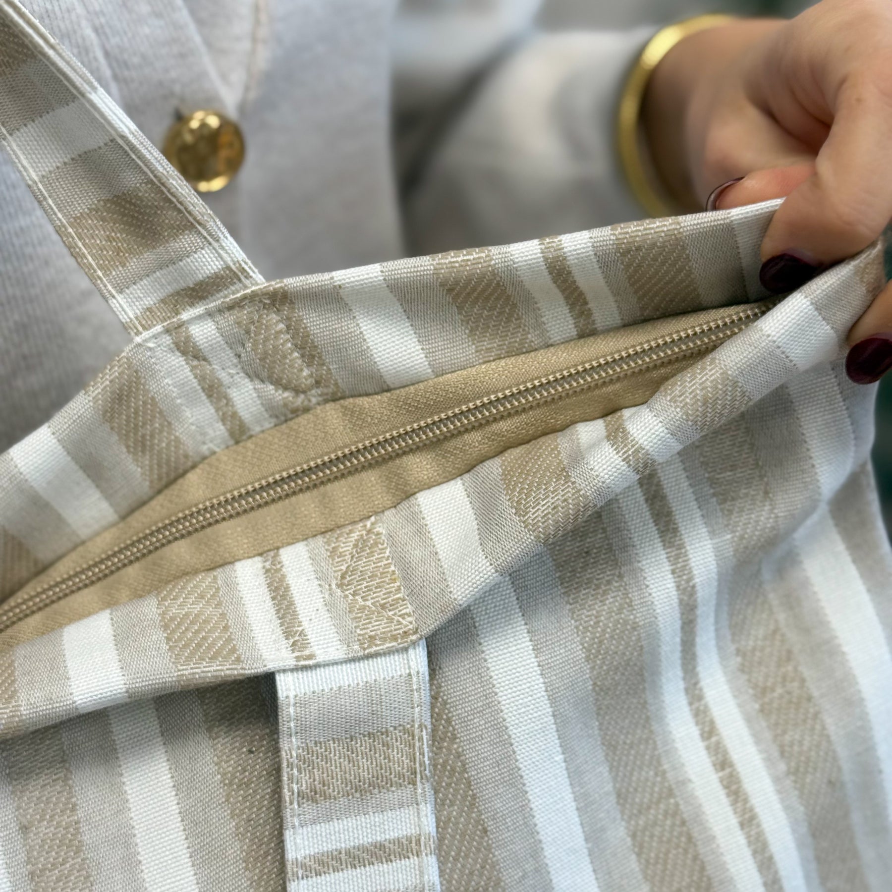 Bolsa shopper grande con asas para llevar al hombro. Con tejido grueso de jacquard 80% algodón y 20% poliéster con estampado a rayas en tonos beige y crudo. Con cremallera en la parte superior. Para su correcto mantenimiento se aconseja lavarlo en frío a mano y no utilizar la secadora.