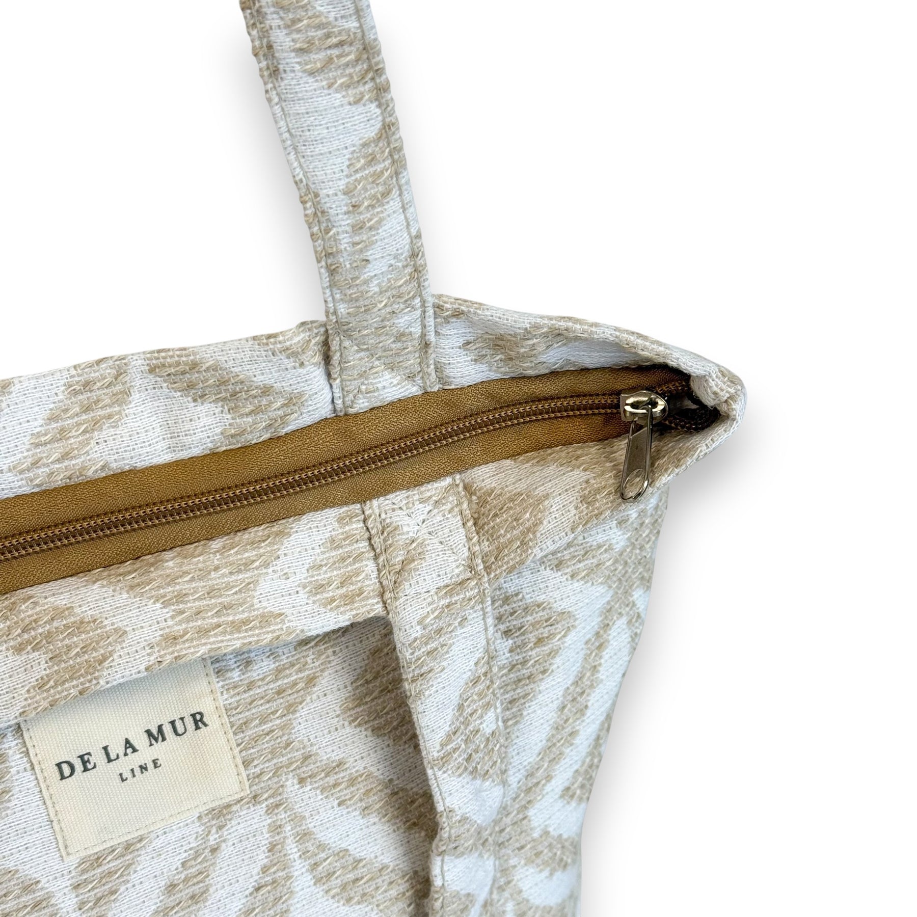 Bolsa "tote bag" con asas para llevar al hombro. Con tejido grueso de jacquard 80% algodón y 20% poliéster con estampado geométrico en tonos beige y crudo. Con cremallera en la parte superior. Para su correcto mantenimiento se aconseja lavarlo en frío y no utilizar secadora.