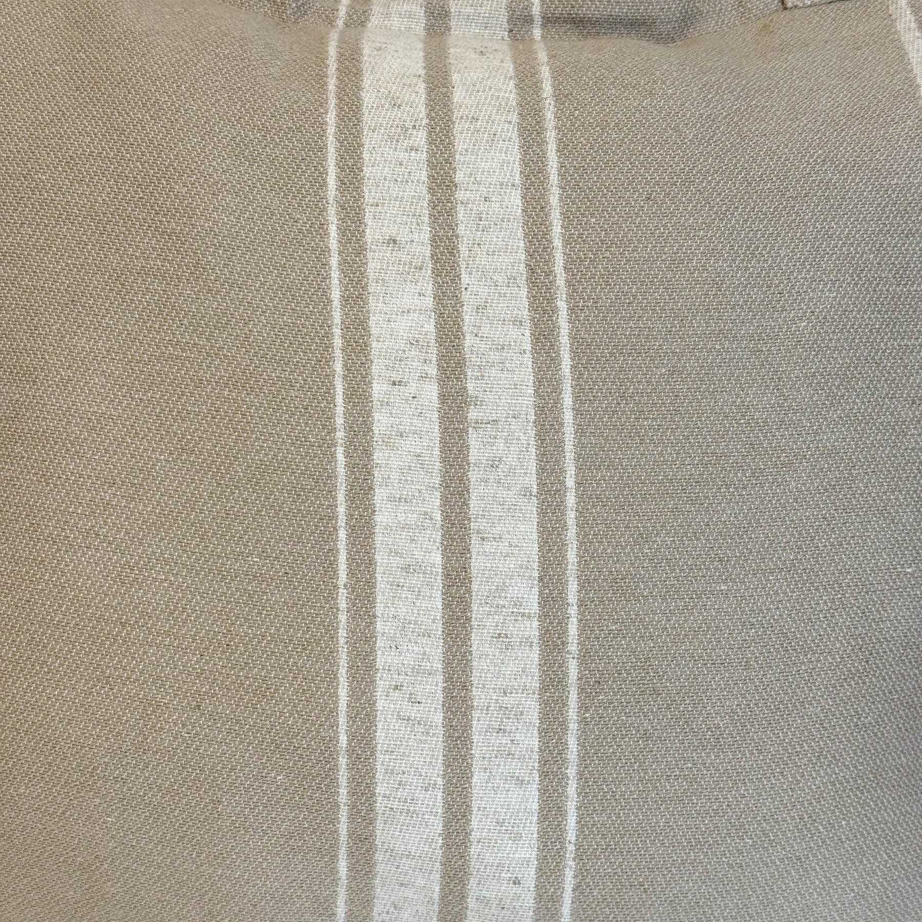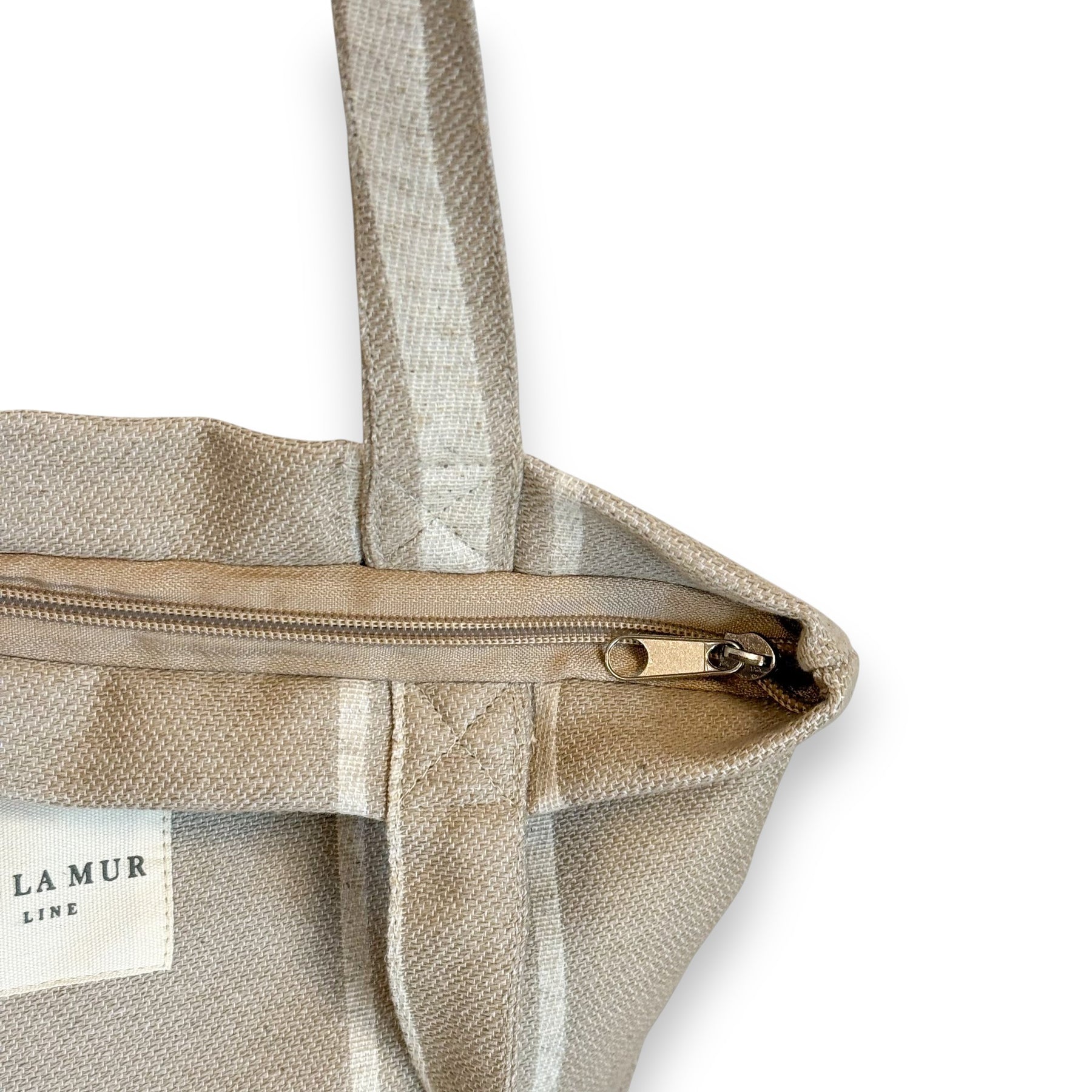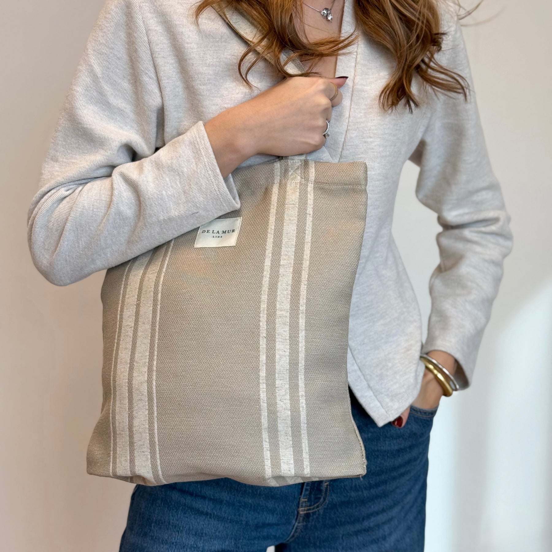 Bolsa "tote bag" con asas para llevar al hombro. Con tejido grueso de jacquard 80% algodón y 20% poliéster con estampado a rayas crudas sobre fondo beige. Con cremallera en la parte superior. Para su correcto mantenimiento se aconseja lavarlo en frío y no utilizar secadora.