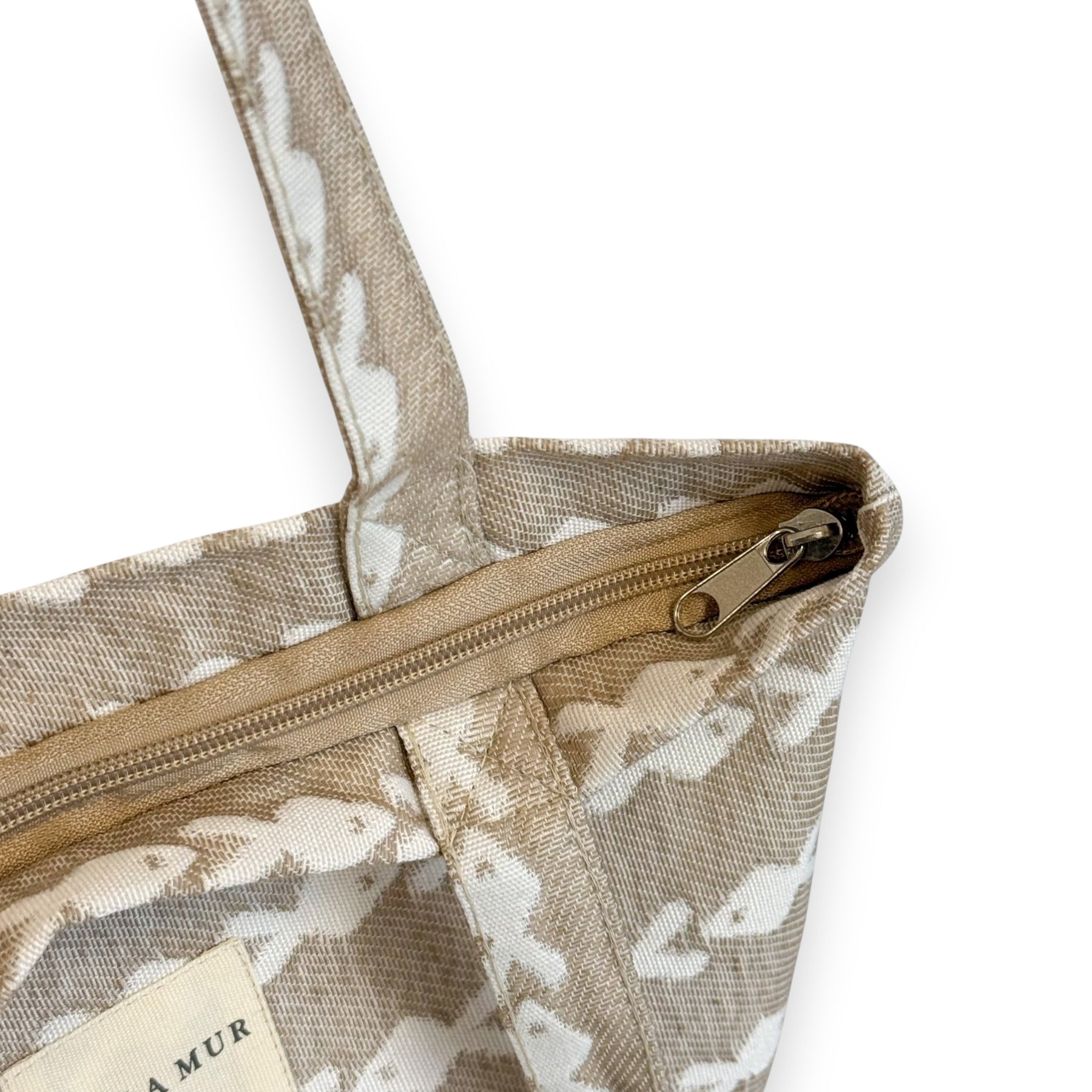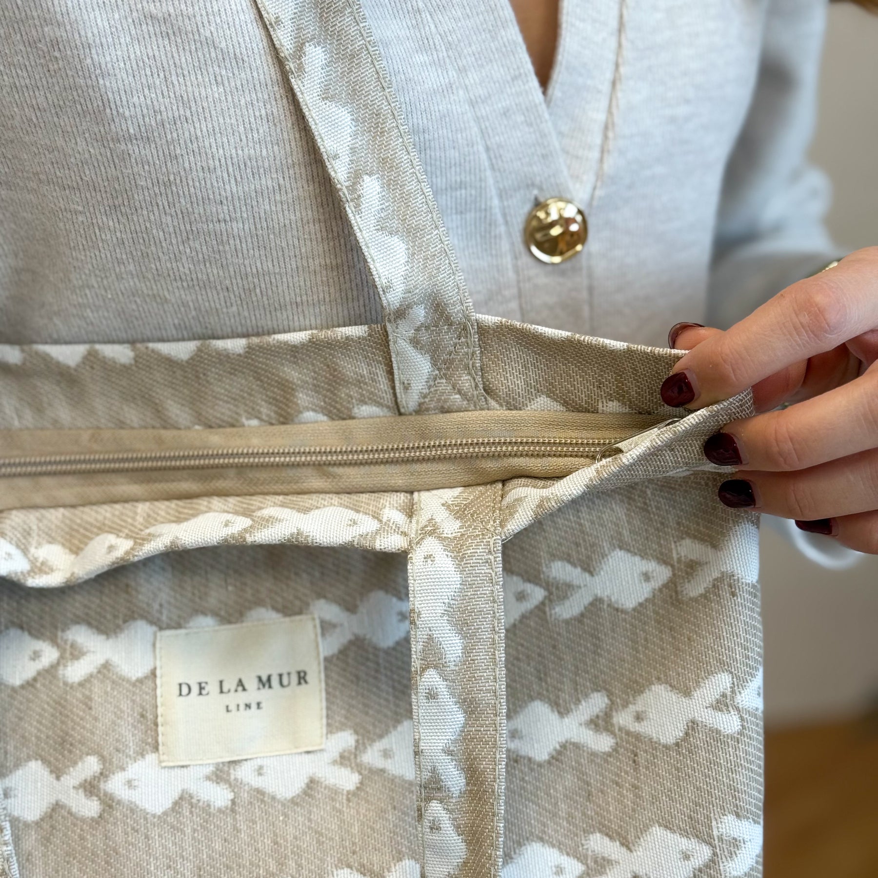 Bolsa "tote bag" con asas para llevar al hombro. Con tejido grueso de jacquard 80% algodón y 20% poliéster con estampado de peces de color crudo sobre fondo beige. Con cremallera en la parte superior. Para su correcto mantenimiento se aconseja lavarlo en frío y no utilizar secadora.