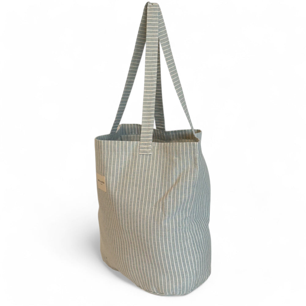 Bolsa shopper grande con asas para llevar al hombro. Con tejido fino con estampado a rayas de color crudo sobre fondo verde agua. Para su correcto mantenimiento se aconseja lavarlo en frío a mano y no utilizar la secadora.