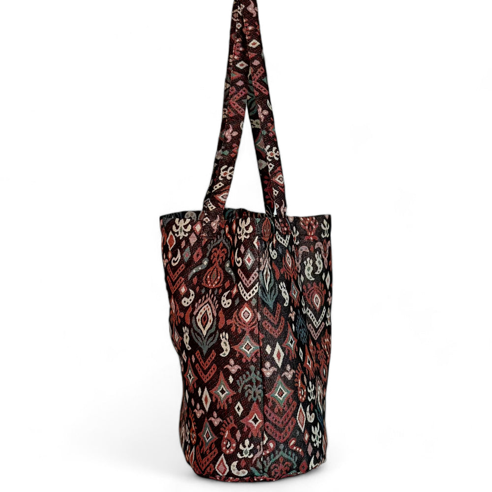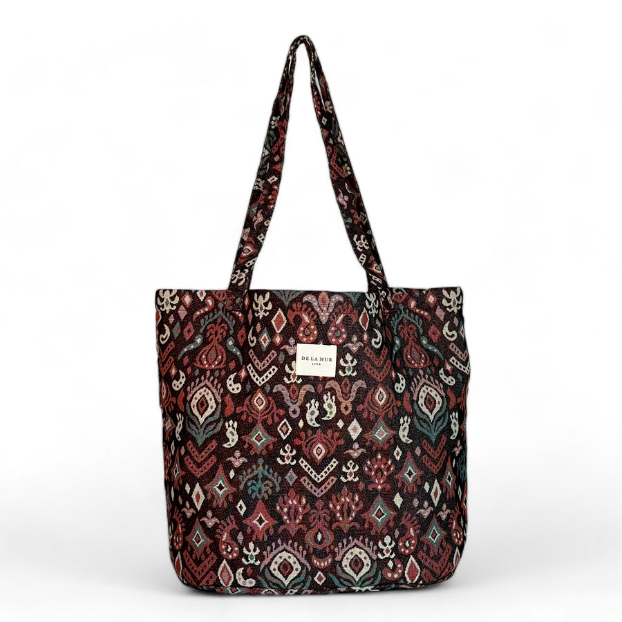 Bolsa shopper grande con asas para llevar al hombro. Con tejido grueso de jacquard con estampado geométrico en tonos granate. Para su correcto mantenimiento se aconseja lavarlo en frío a mano y no utilizar secadora.