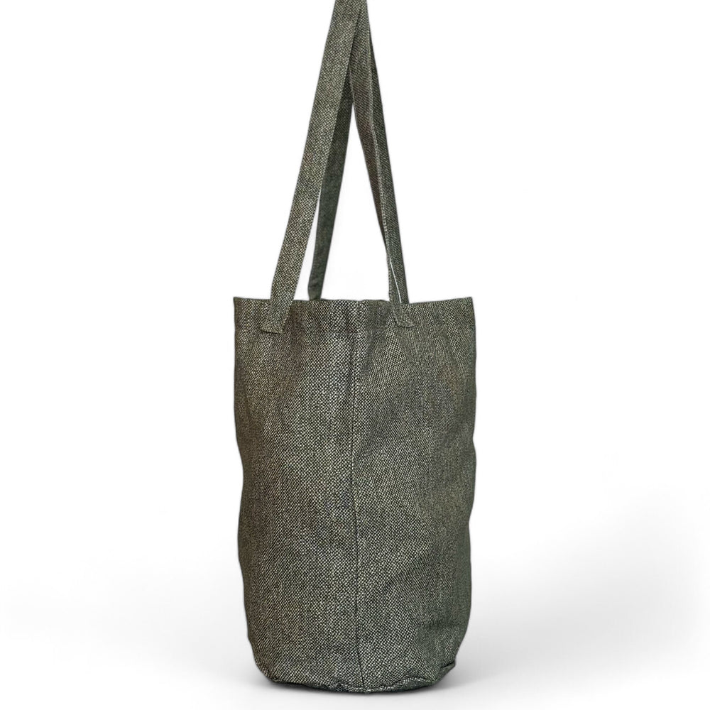 Bolsa shopper grande con asas para llevar al hombro. Con tejido fino con estampado tipo saco de color caqui oscuro. Para su correcto mantenimiento se aconseja lavarlo en frío a mano y no utilizar secadora.