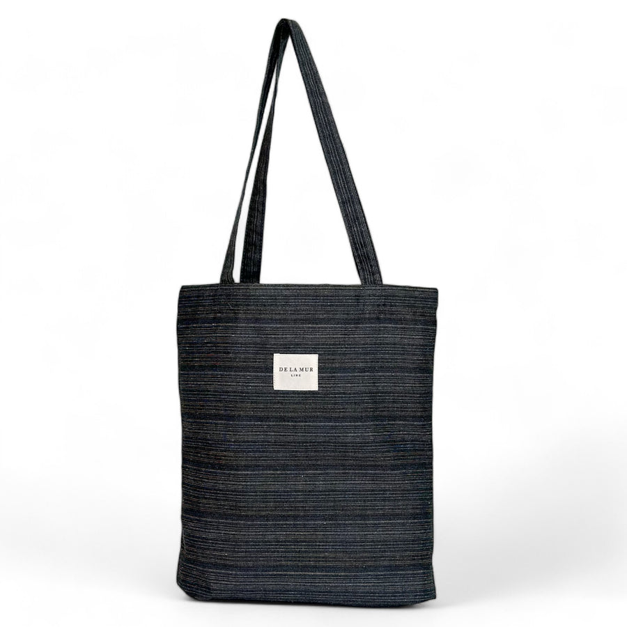 Bolsa “tote bag” con asas para llevar al hombro. Con tejido grueso a rayas en tono azul oscuro y marrón. Para su correcto mantenimiento se aconseja lavarlo en frío y no utilizar secadora.