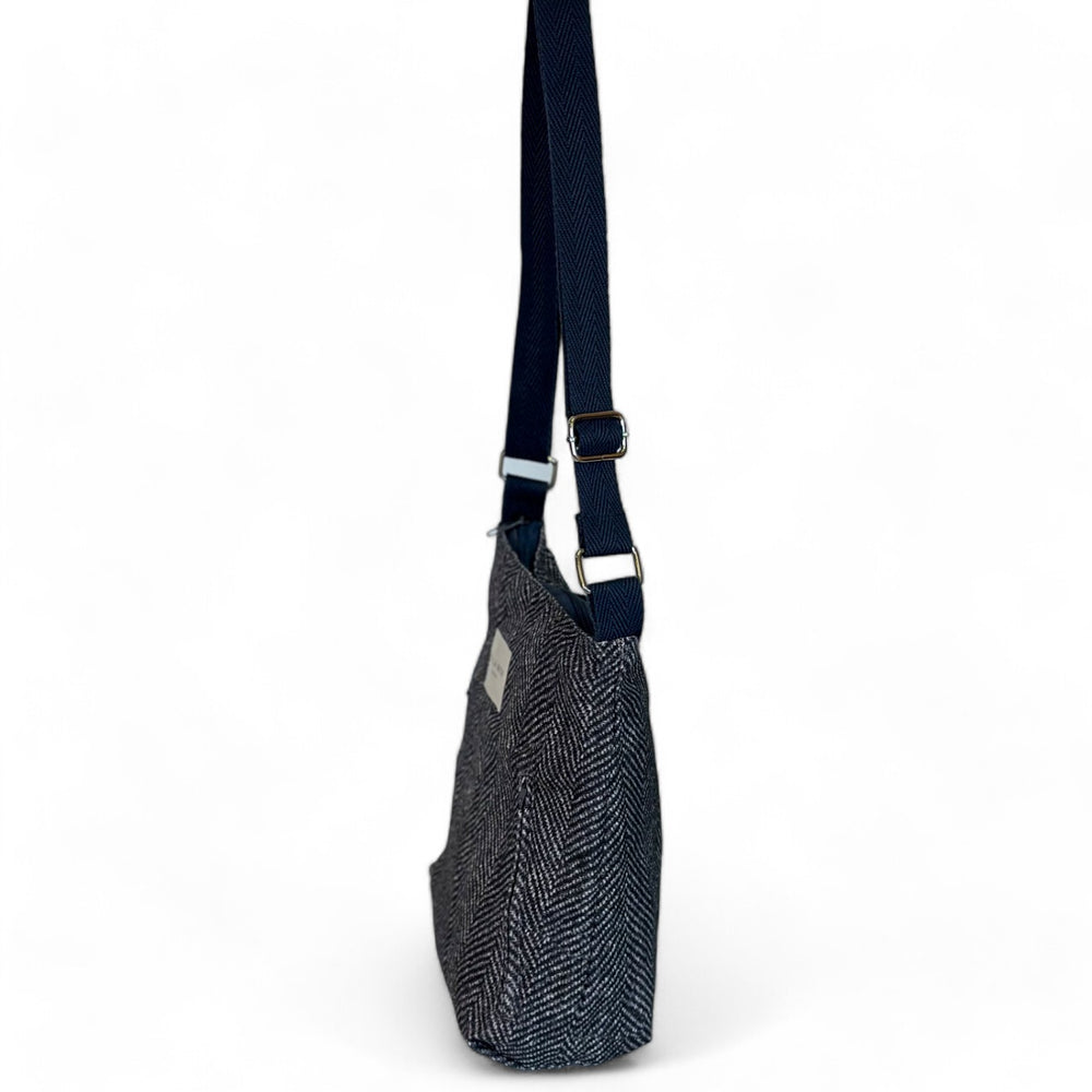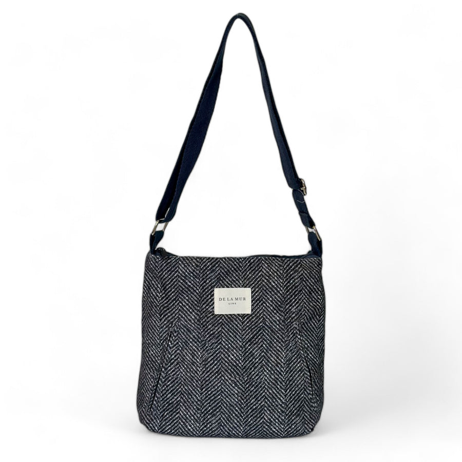 Bolso mediano tipo bandolera con asa larga ajustable de cinta de espiga de algodón de color gris oscuro. Con un tejido fino con estampado de espeiga de color gris oscuro. Cierre superior con cremallera. Dos bolsillos en la parte frontal con cremallera. Forrado de tejido grueso de color gris en la parte interior. Bolsillo interior con cremallera. Para su correcto mantenimiento se aconseja lavarlo en frío a mano y no utilizar secadora.