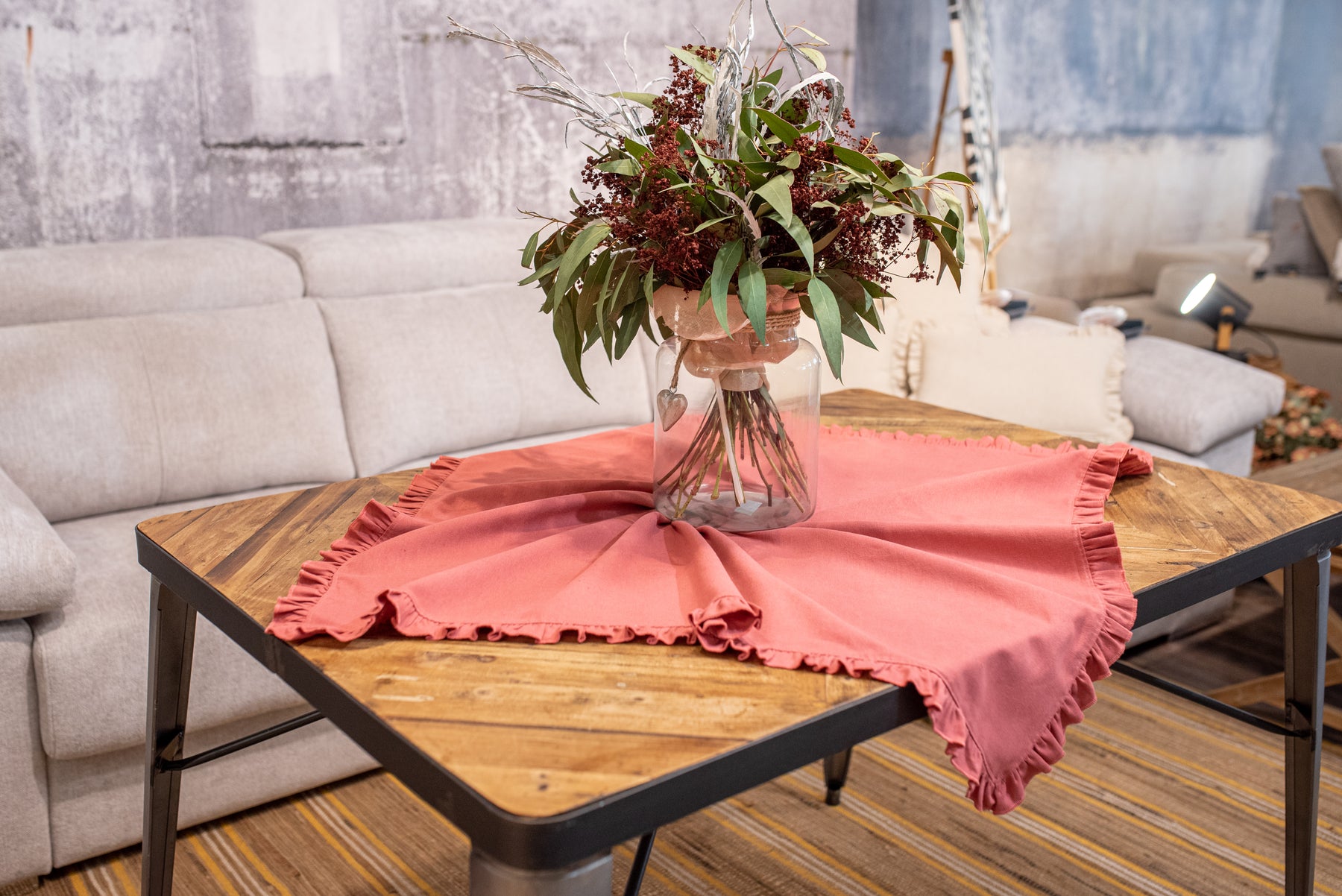 Camino de mesa cuadrado con volantes en los extremos. Con tejido con 20% de lino y 80% de algodón en tono rojizo. Para su correcto mantenimiento se aconseja lavarlo en frío y no utilizar secadora.