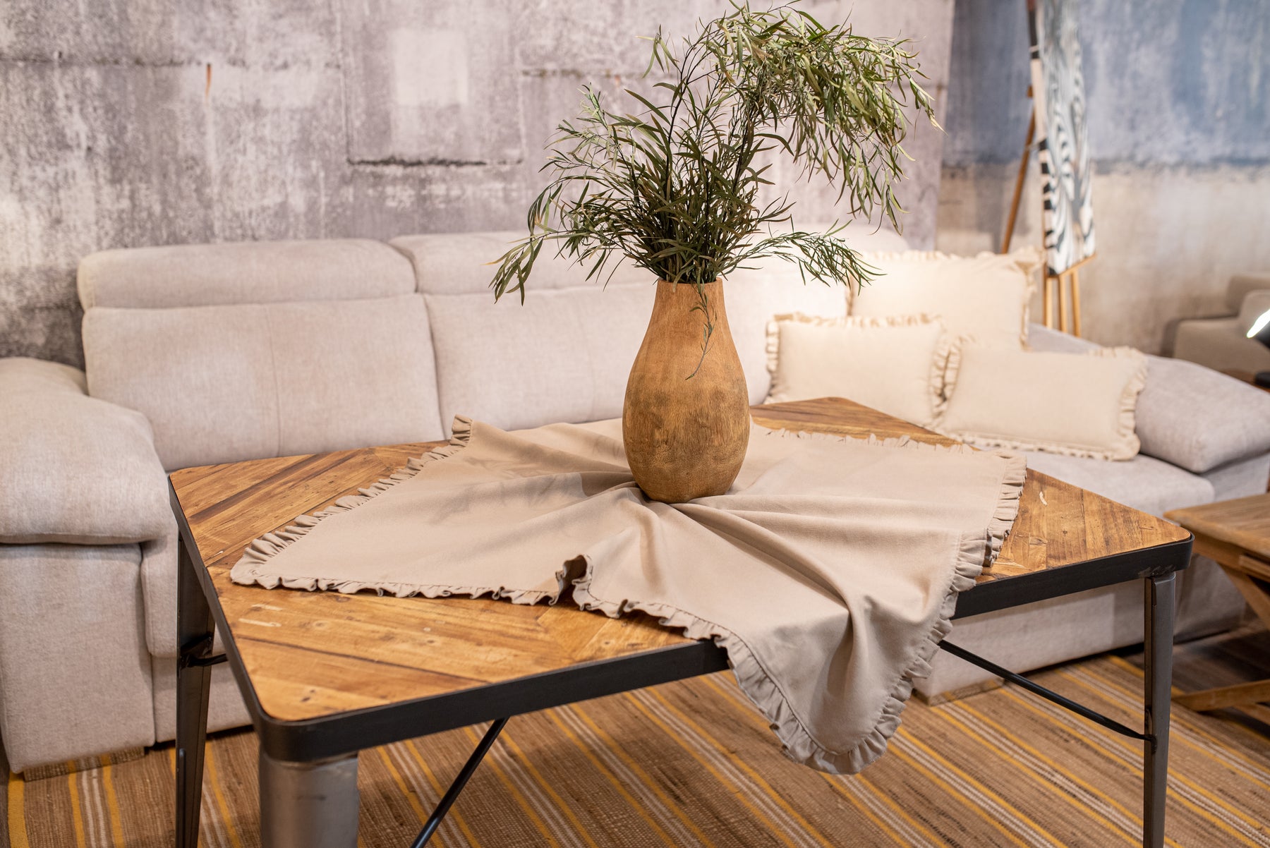 Camino de mesa cuadrado con volantes en los extremos. Con tejido con 20% de lino y 80% de algodón en tono topo. Para su correcto mantenimiento se aconseja lavarlo en frío y no utilizar secadora.