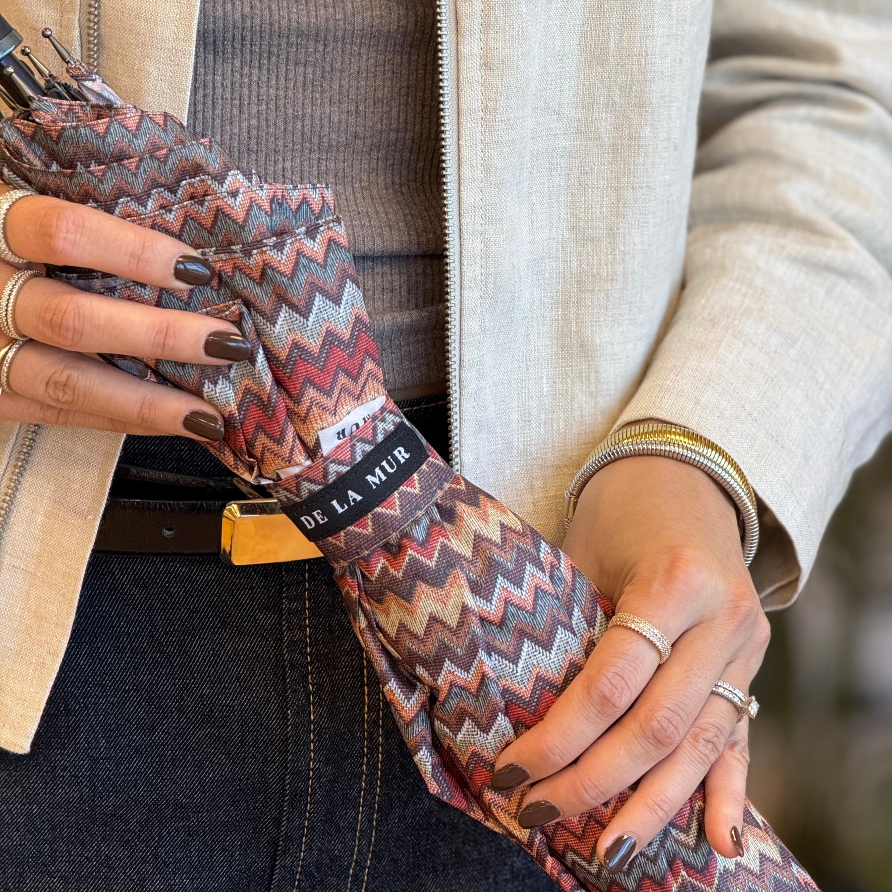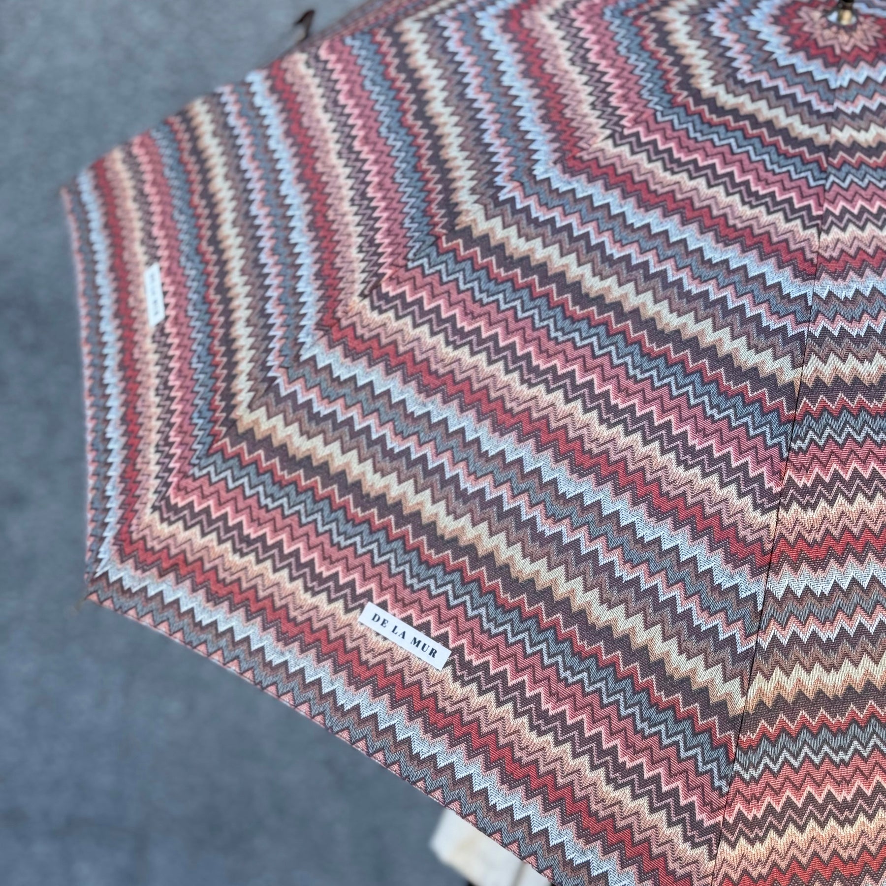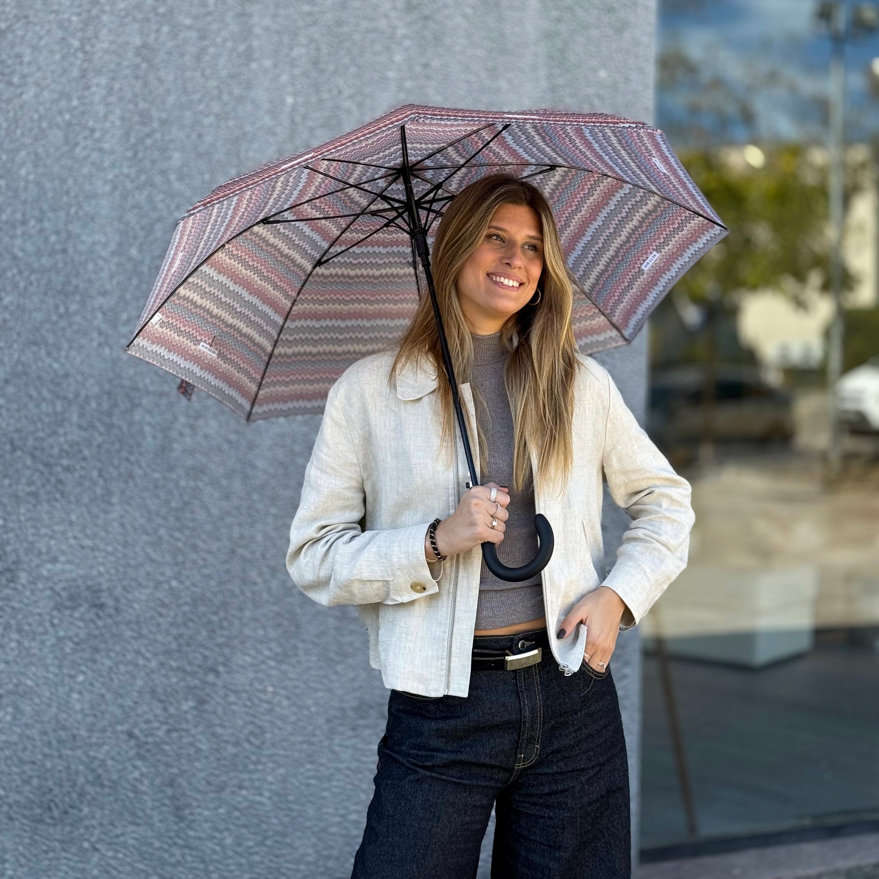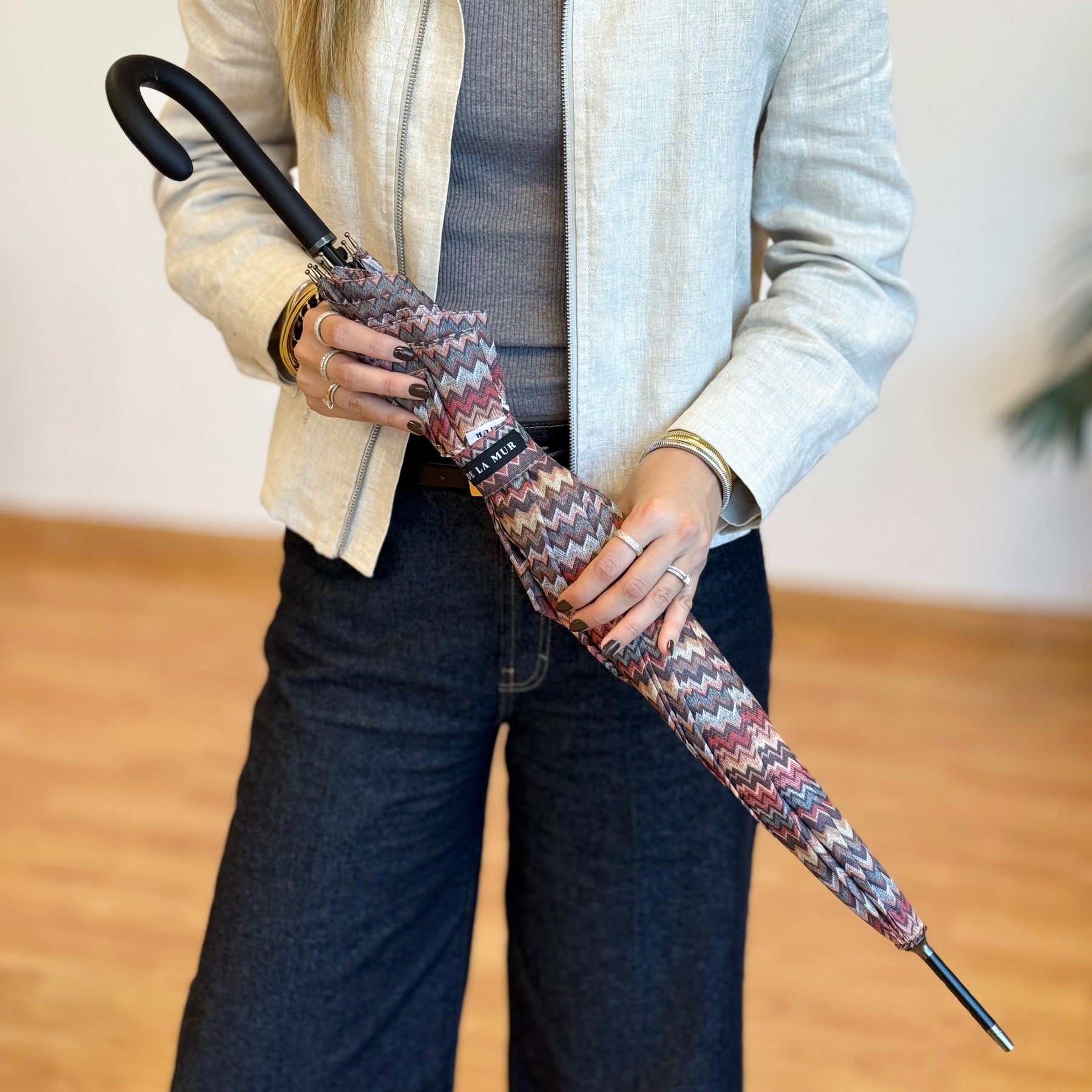 Paraguas largo con tejido de poliéster tipo pongee de secado rápido con estampado tipo zigzag mutlicolor. Puño de plástico y varillas fibra anti-viento. Sistema de apertura automático.