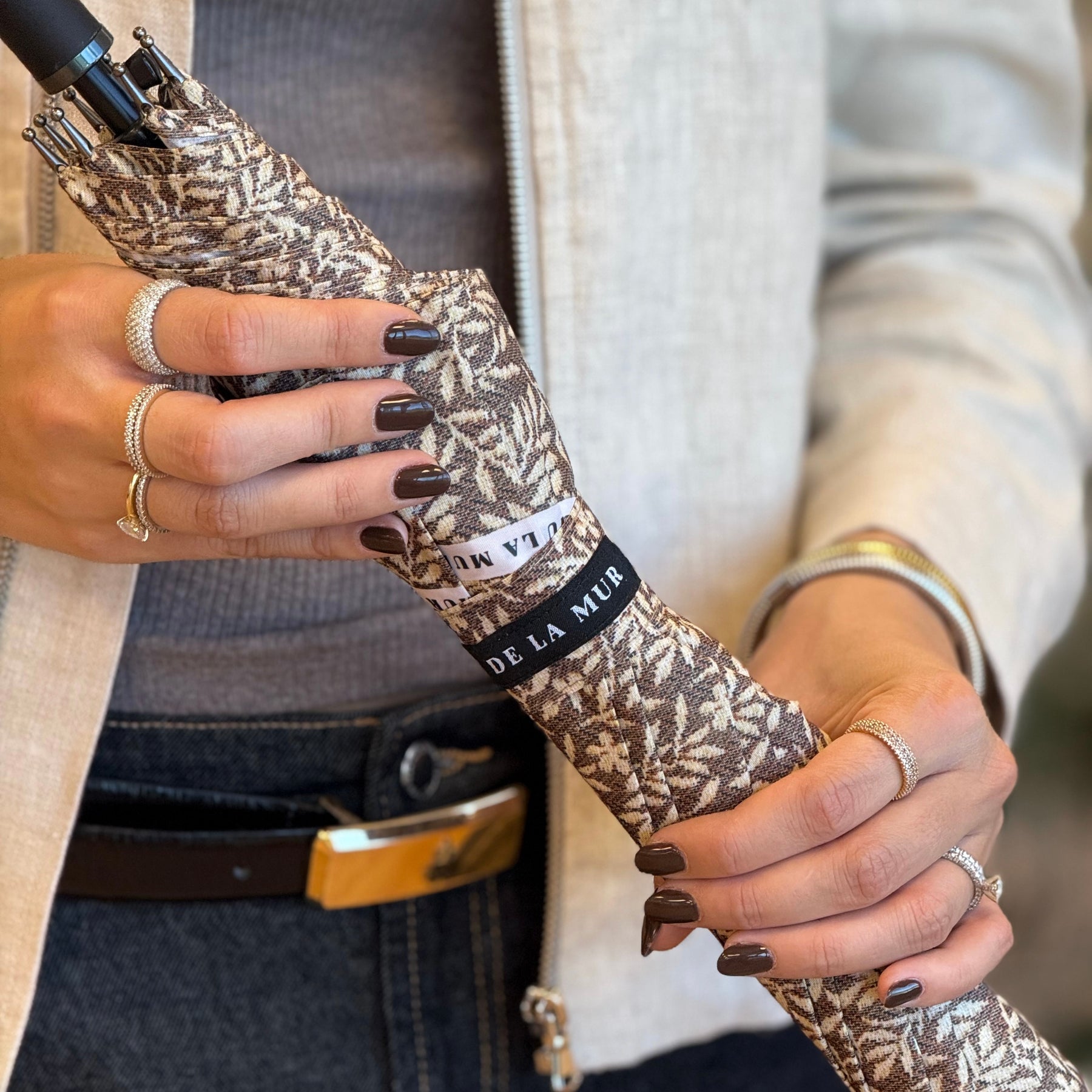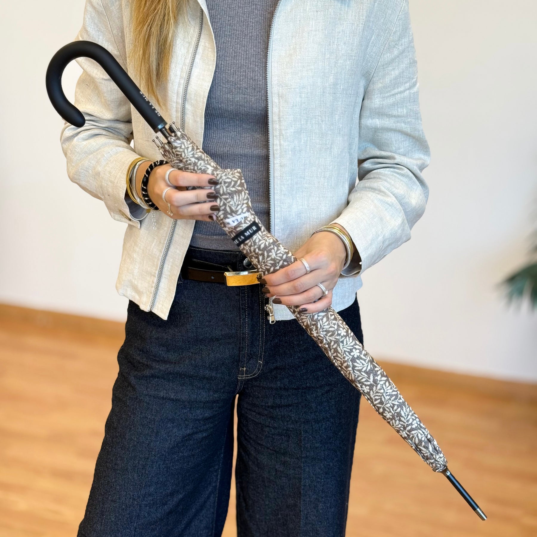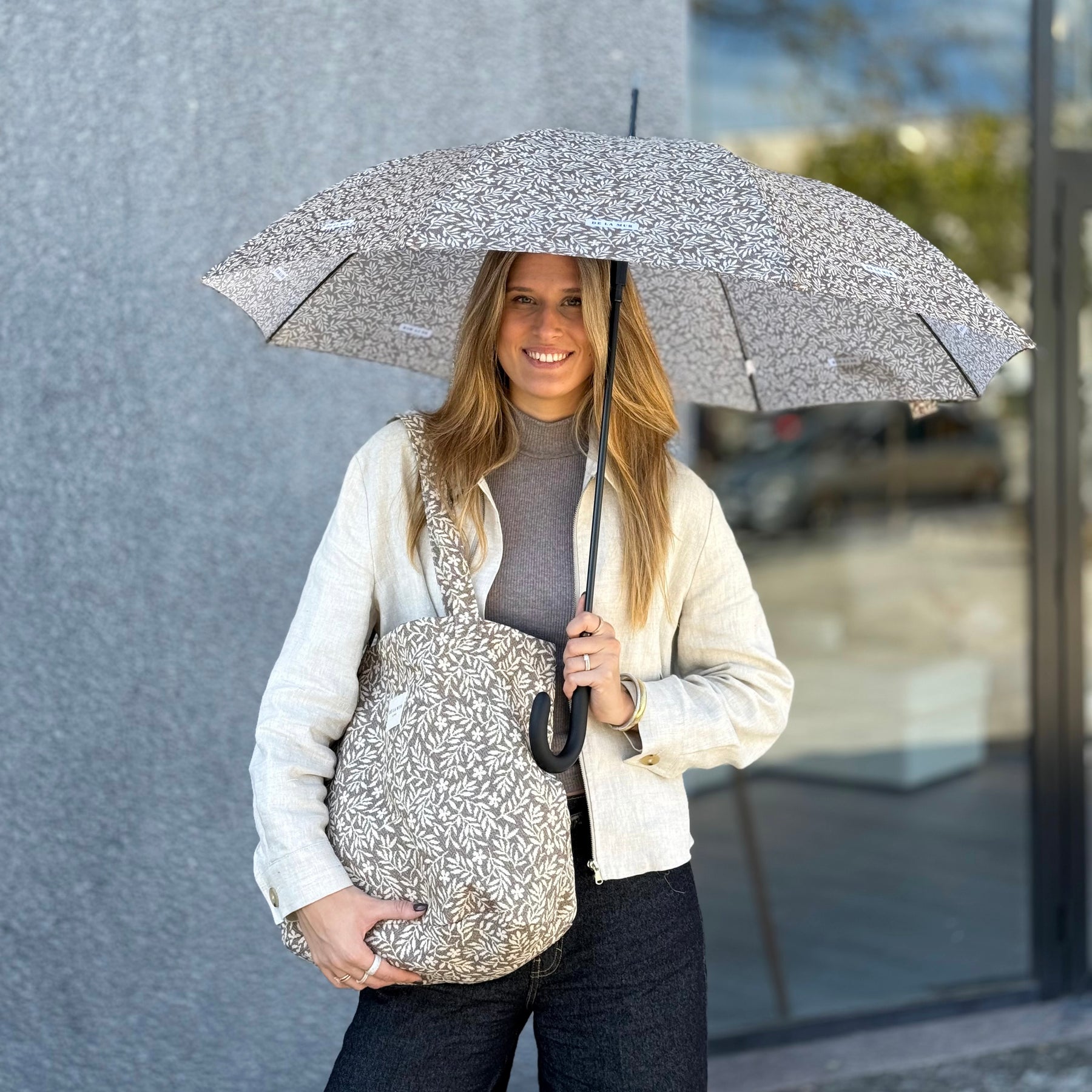 Paraguas largo con tejido de poliéster tipo pongee de secado rápido con estampado floral de color crudo sobre fondo color topo. Puño de plástico y varillas fibra anti-viento. Sistema de apertura automático.