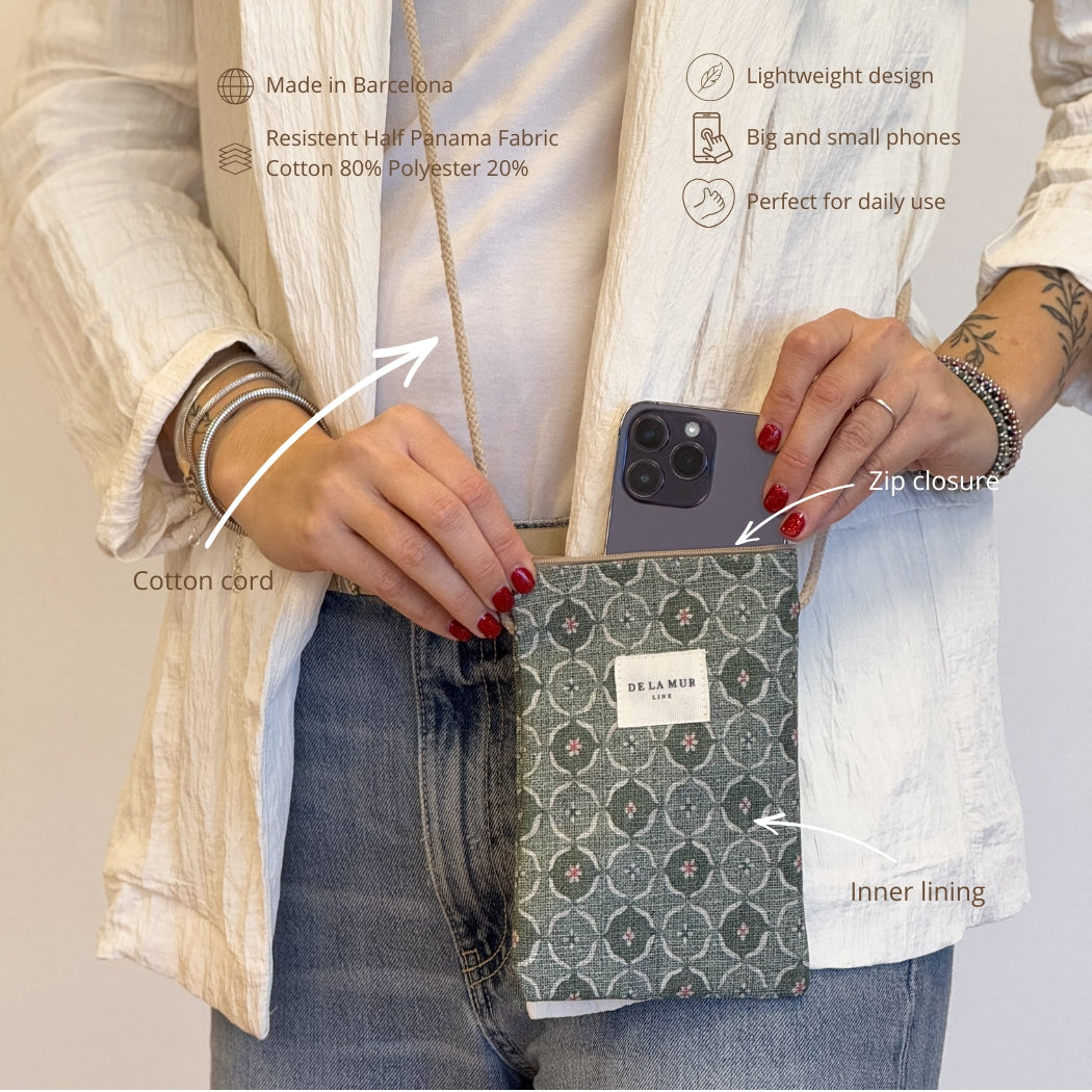 Bolsito porta móvil para llevar tipo bandolera. Con cremallera en la parte superior y cordón largo de algodón de color beige. Con tejido fino con estampado geométrico en tonos verdes. Cada articulo puede tener una variación en el estampado, dependiendo de donde se haya efectuado el corte de la pieza. Forrado de tejido grueso de color gris en la parte interior. Para su correcto mantenimiento se aconseja lavarlo en frío a mano y no utilizar secadora.