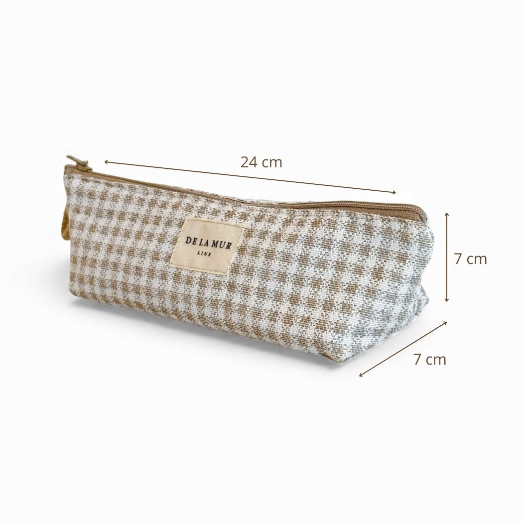 Estuche con cremallera en la parte superior. Con tejido grueso de jacquard 80% algodón y 20% poliéster con estampado a cuadros vichy en tono beige y crudo. Cada articulo puede tener una variación en el estampado, dependiendo de donde se haya efectuado el corte de la pieza. Forrado de tejido grueso de color gris en la parte interior. Para su correcto mantenimiento se aconseja lavarlo en frío y no utilizar secadora.