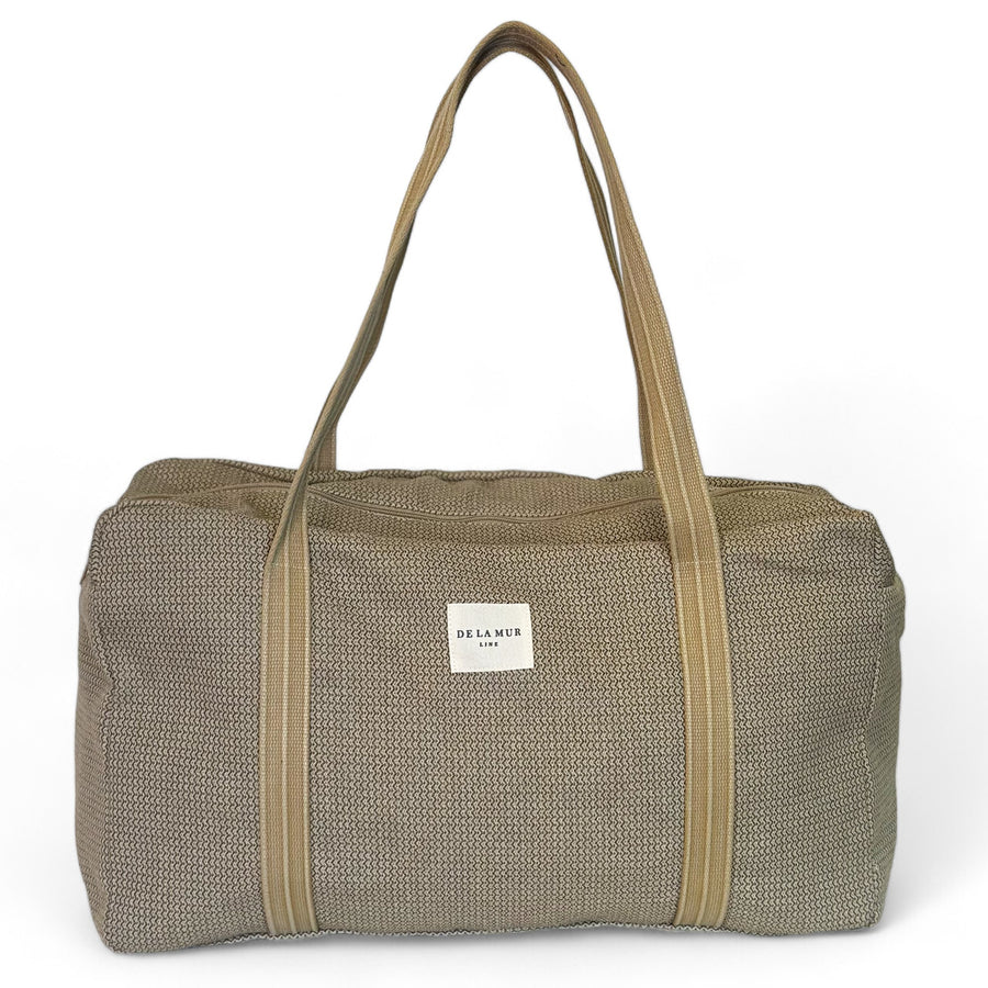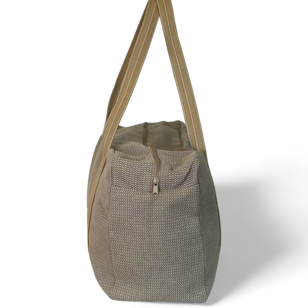 Bolsa de deporte con asas medianas en la parte superior de cinta de algodón de color beige. Con tejido grueso con granito de color beige. Cierre superior con cremallera. Bolsillo interior con cremallera. Forrado de tejido grueso de color gris en la parte interior. Para su correcto mantenimiento se aconseja lavarlo en frío a mano y no utilizar secadora.