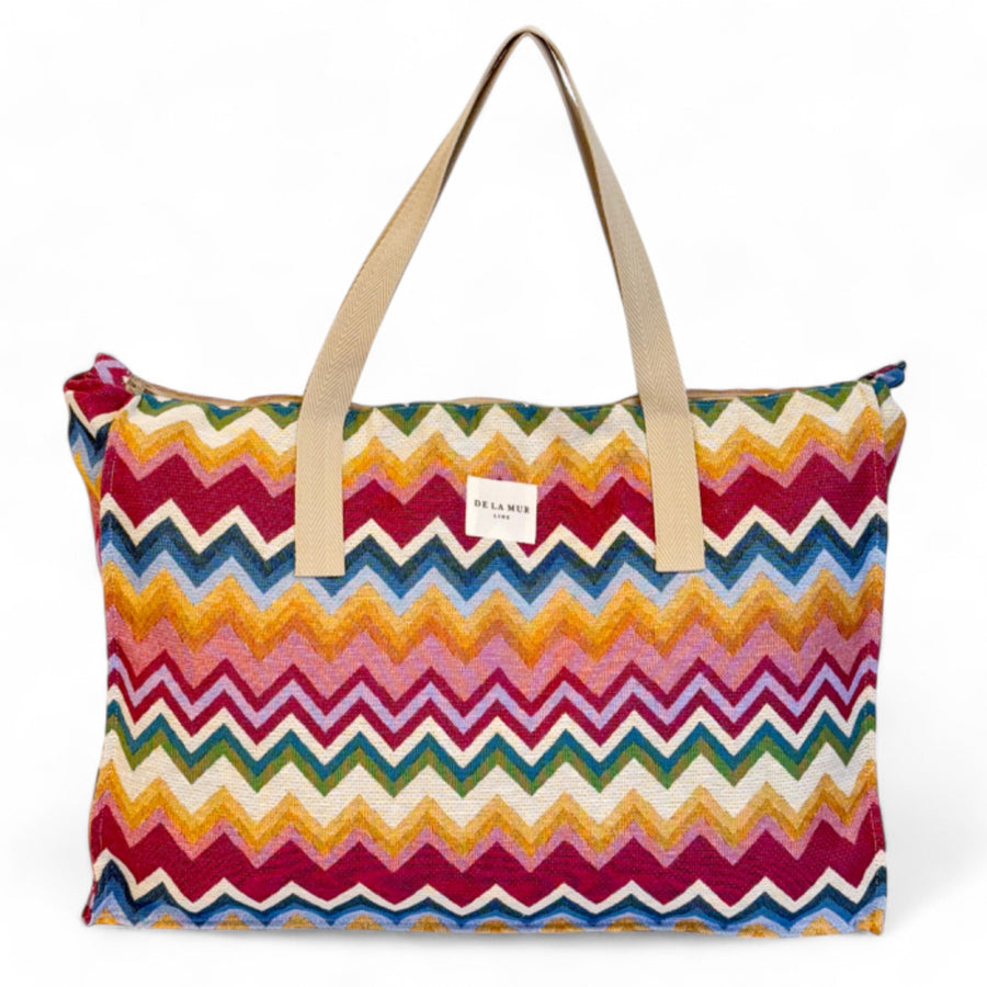 Bolsa de fin de semana con asas medianas en la parte superior de cinta de espiga de algodón de color beige. Con tejido grueso de jacquard con estampado zigzag en tonos rosados y azulados. Cierre superior con cremallera. Bolsillo interior con cremallera. Forrado de tejido grueso de color gris en la parte interior. Para su correcto mantenimiento se aconseja lavarlo en frío a mano y no utilizar secadora.