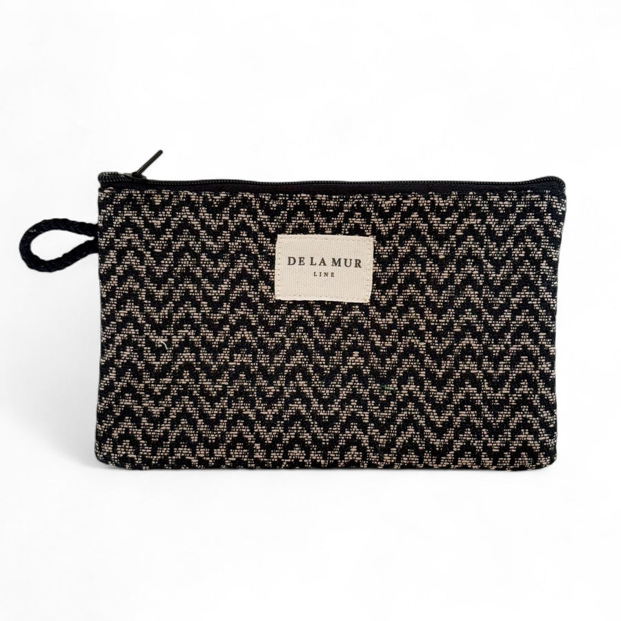 Mini neceser con cremallera en la parte superior y pequeña asa de cordón de color negro en el lateral. Con tejido grueso de jacquard con estampado tipo zigzag de color negro y beige. Cada articulo puede tener una variación en el estampado, dependiendo de donde se haya efectuado el corte de la pieza. Forrado de tejido grueso de color gris en la parte interior. Para su correcto mantenimiento se aconseja lavarlo en frío a mano y no utilizar secadora.