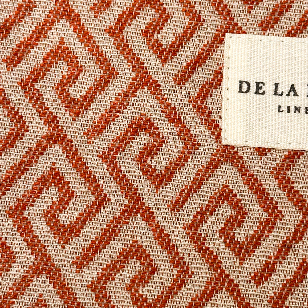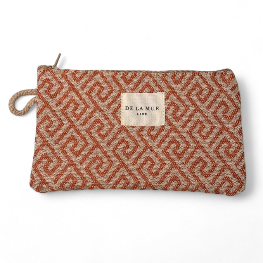 Mini neceser con cremallera en la parte superior y pequeña asa de cordón de color beige en el lateral. Con tejido grueso de jacquard con estampado geométrico en tono teja. Cada articulo puede tener una variación en el estampado, dependiendo de donde se haya efectuado el corte de la pieza. Forrado de tejido grueso de color gris en la parte interior. Para su correcto mantenimiento se aconseja lavarlo en frío a mano y no utilizar secadora.