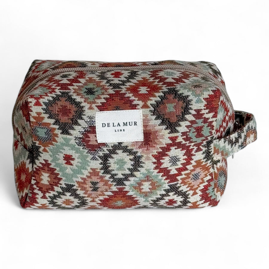 Neceser mediano con cremallera en la parte superior y con asa lateral. Con tejido grueso de jacquard con estampado geométrico multicolor. Para su correcto mantenimiento se aconseja lavarlo en frío y no utilizar secadora.
