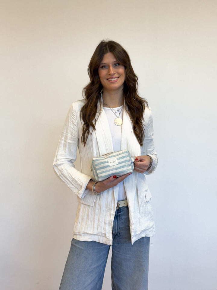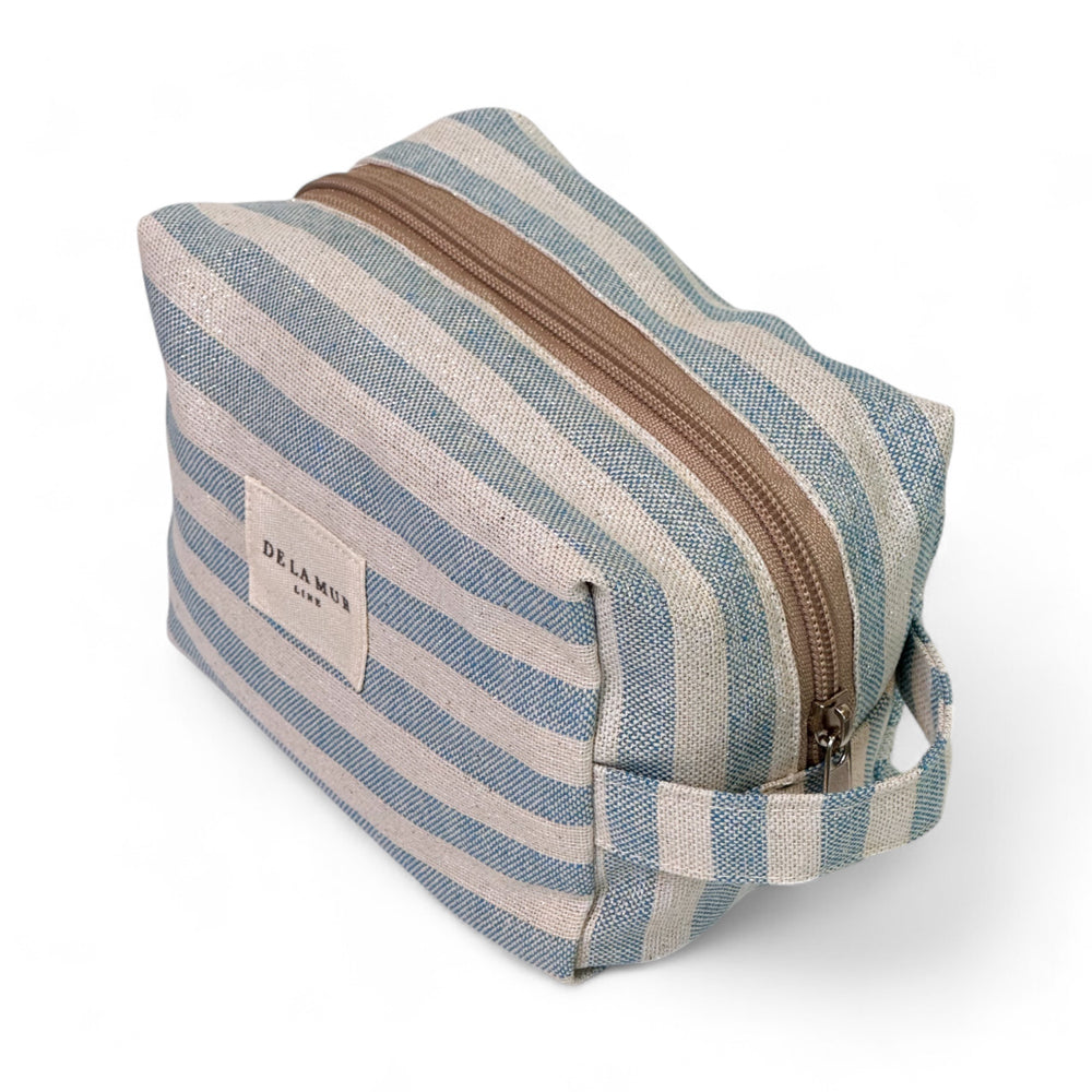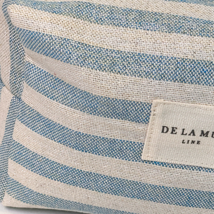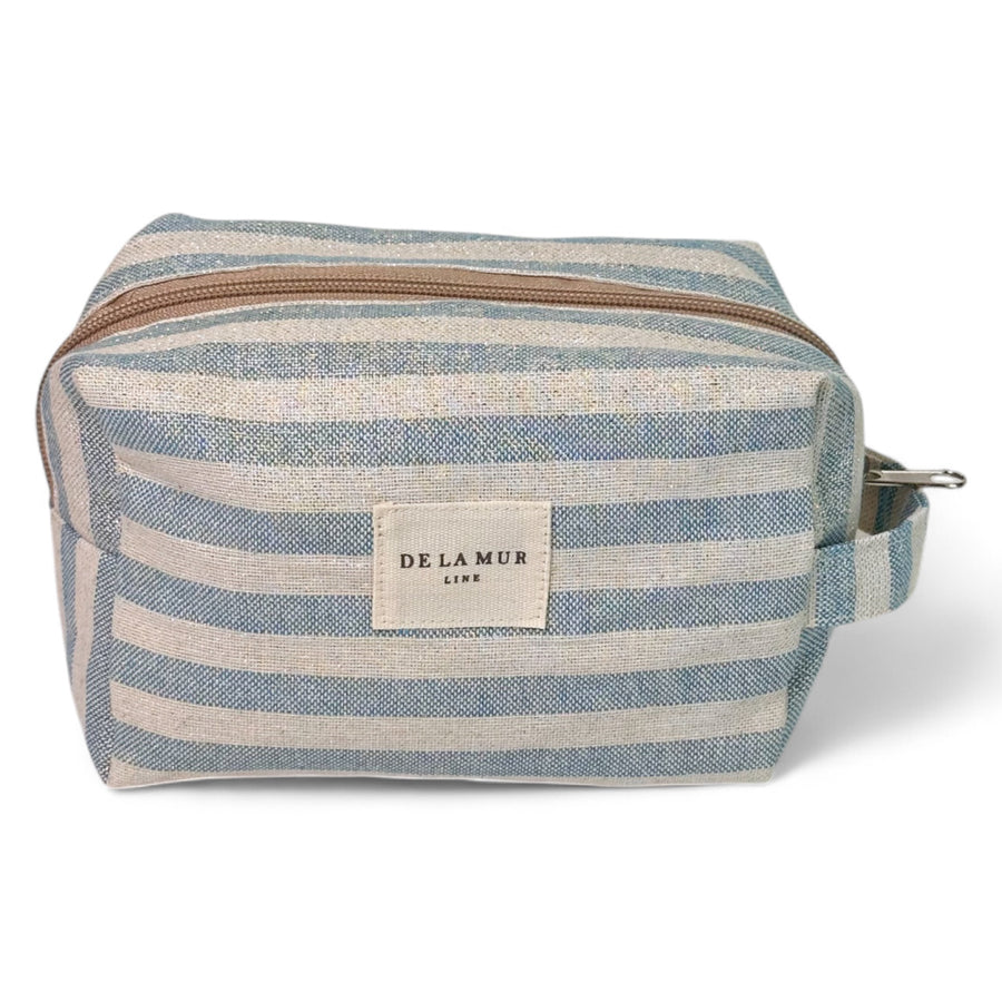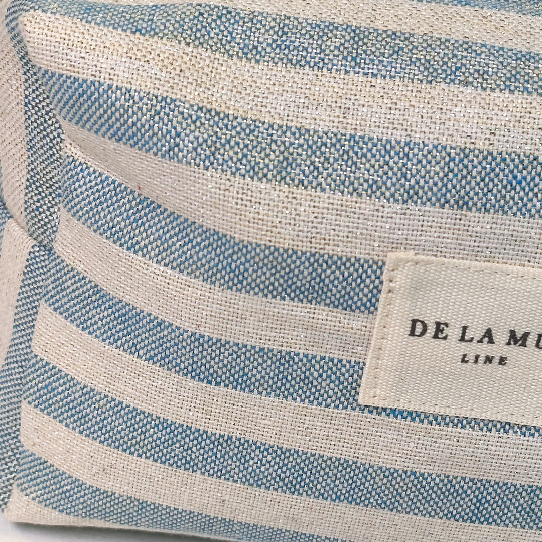 Neceser mediano con cremallera en la parte superior y con asa lateral. Con tejido fino de half-panama con estampado a rayas de color azul y crudo con lurex brillante dorado y plateado. Para su correcto mantenimiento se aconseja lavarlo en frío y no utilizar secadora.