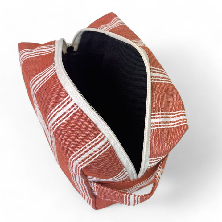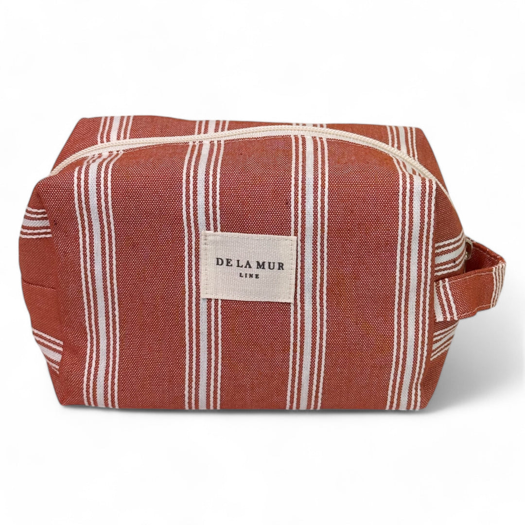 Neceser mediano con cremallera en la parte superior y con asa lateral. Con tejido fino con estampado a rayas de color crudo sobre fondo teja. Para su correcto mantenimiento se aconseja lavarlo en frío y no utilizar secadora.