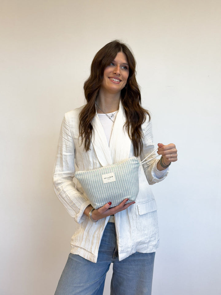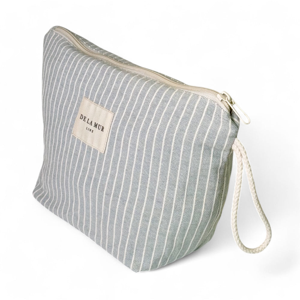 Neceser con cremallera en la parte superior y asa de cordón de color crudo en el lateral. Con tejido fino a rayas de color crudo sobre fondo verde agua. Forrado de tejido grueso de color gris en la parte interior. Para su correcto mantenimiento se aconseja lavarlo en frío a mano y no utilizar secadora.