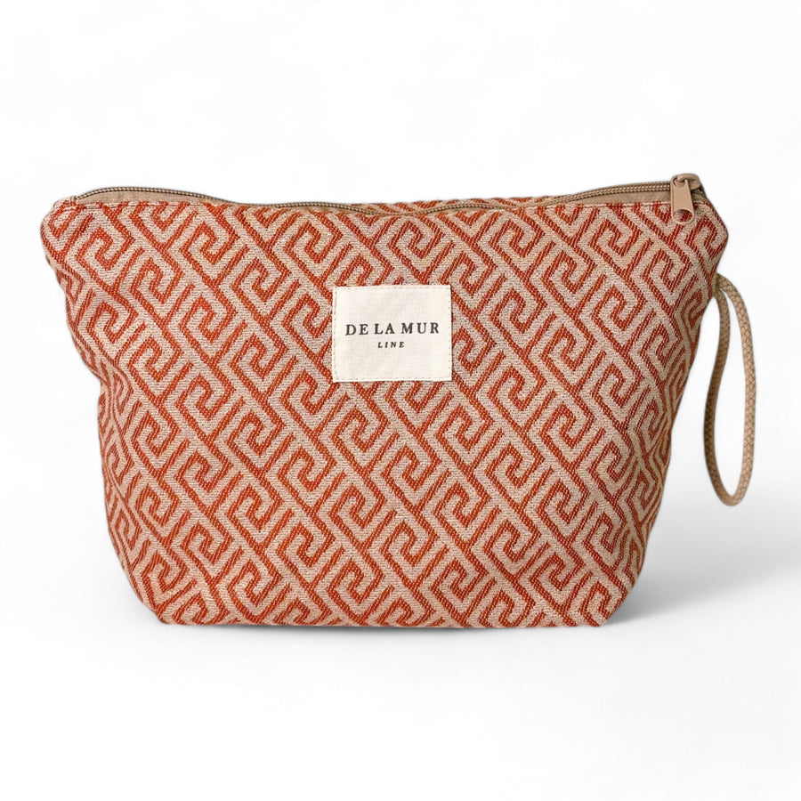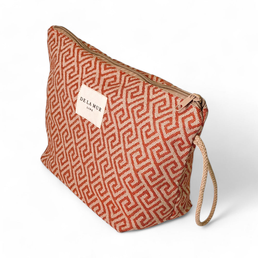 Neceser con cremallera en la parte superior y asa de cordón de color beige en el lateral. Con tejido grueso de jacquard con estampado geométrico en tono teja. Forrado de tejido grueso de color gris en la parte interior. Para su correcto mantenimiento se aconseja lavarlo en frío a mano y no utilizar secadora.