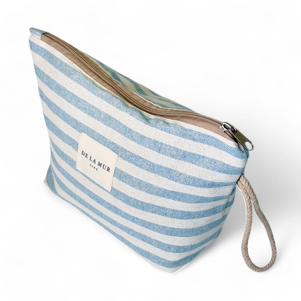 Neceser con cremallera en la parte superior y asa de cordón de color beige en el lateral. Con tejido fino de half-panama con estampado a rayas azules y crudo con lurex brillante dorado y plateado. Forrado de tejido grueso de color gris en la parte interior. Para su correcto mantenimiento se aconseja lavarlo en frío a mano y no utilizar secadora.