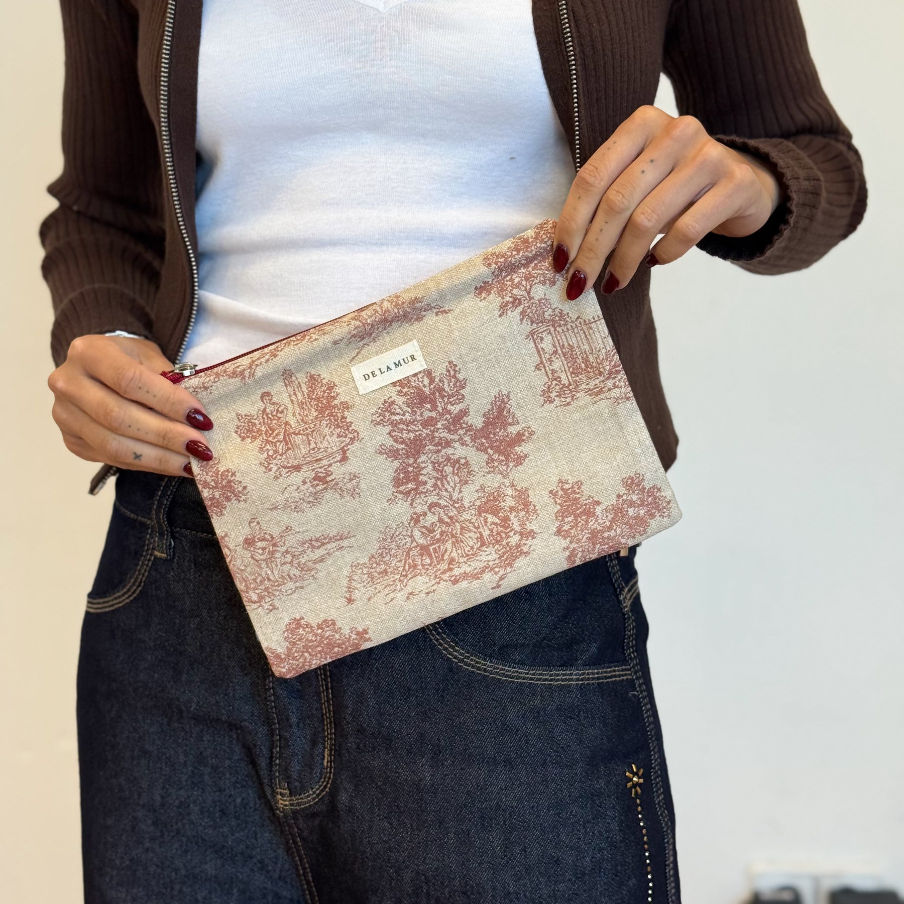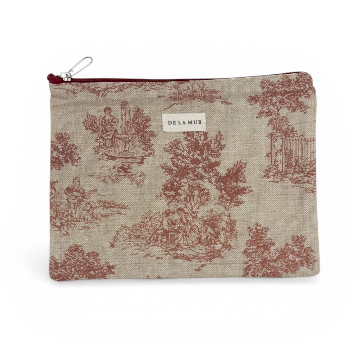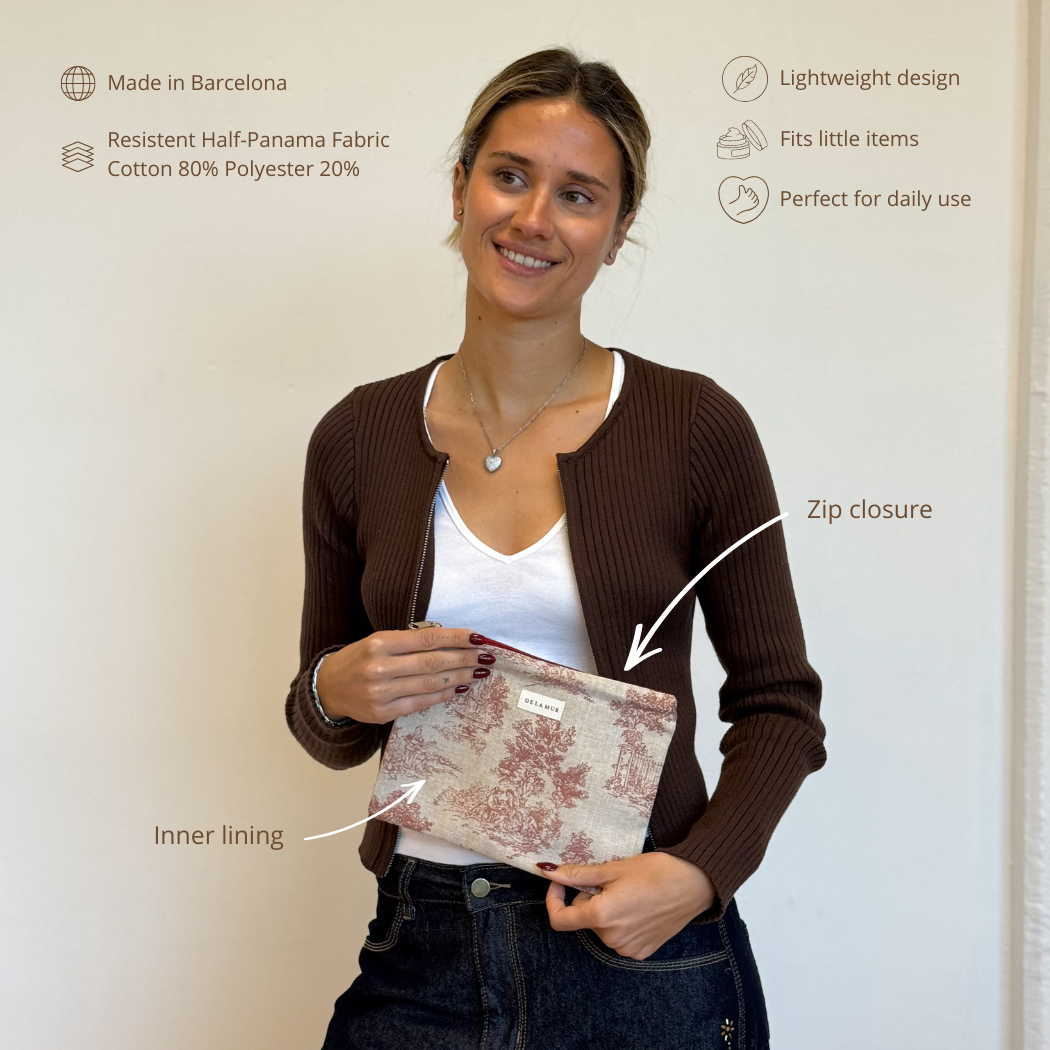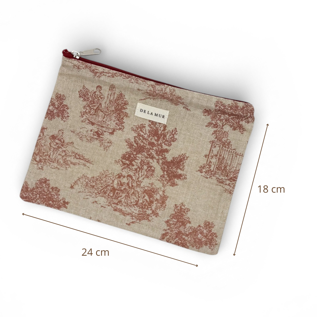 Neceser grande y plano con cremallera granate, confeccionado en tejido half-panama con estampado de toile de jouy granate. Práctico para llevar lo imprescindible en el día a día. Medidas: 24 x 18 cm. Confeccionado en España.