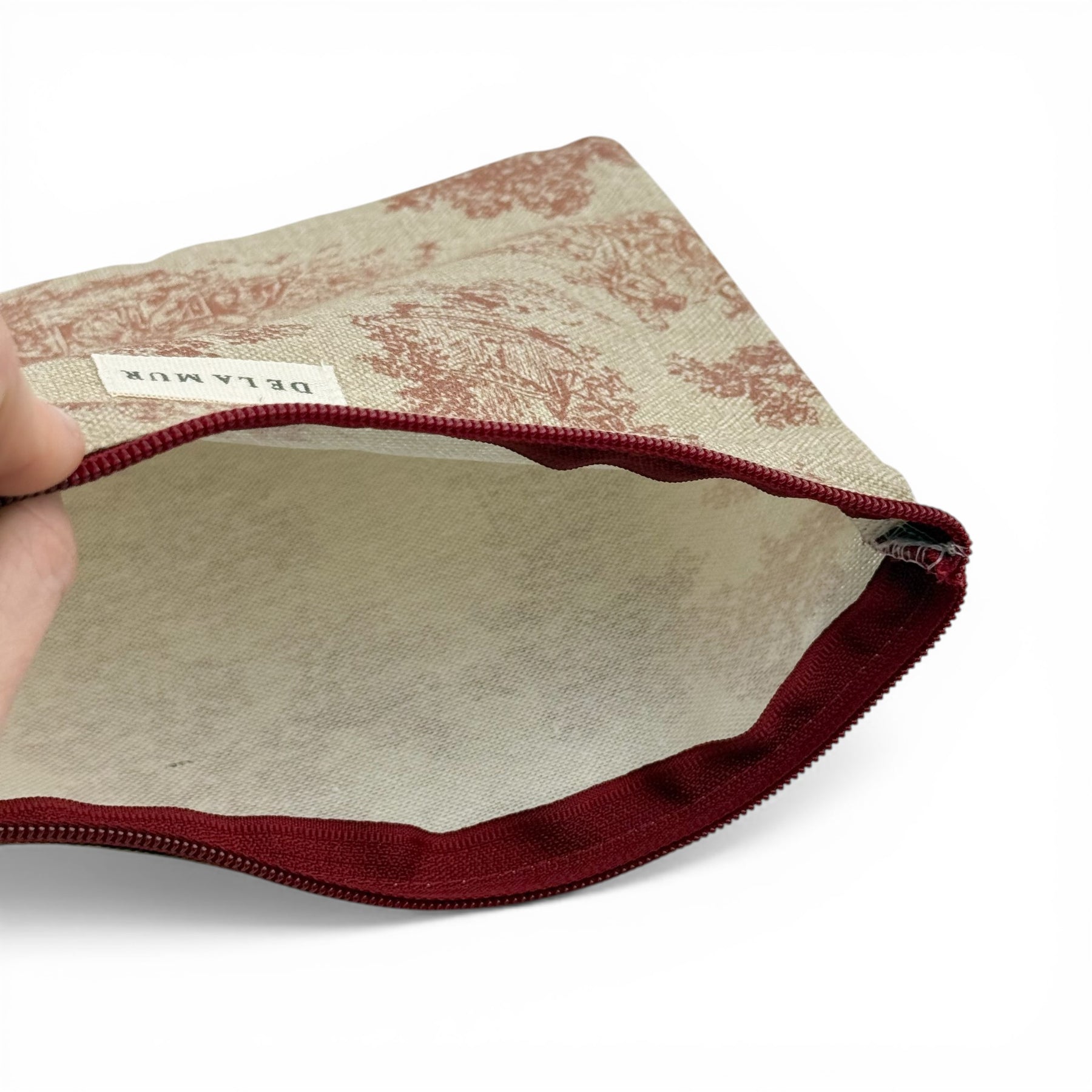 Neceser grande y plano con cremallera granate en la parte superior. Confeccionado con tejido resistente de half-panama 80% algodón y 20% poliéster con estampado de toile de jouy granate. Agradable al tacto, pensado para un uso práctico en el día a día.