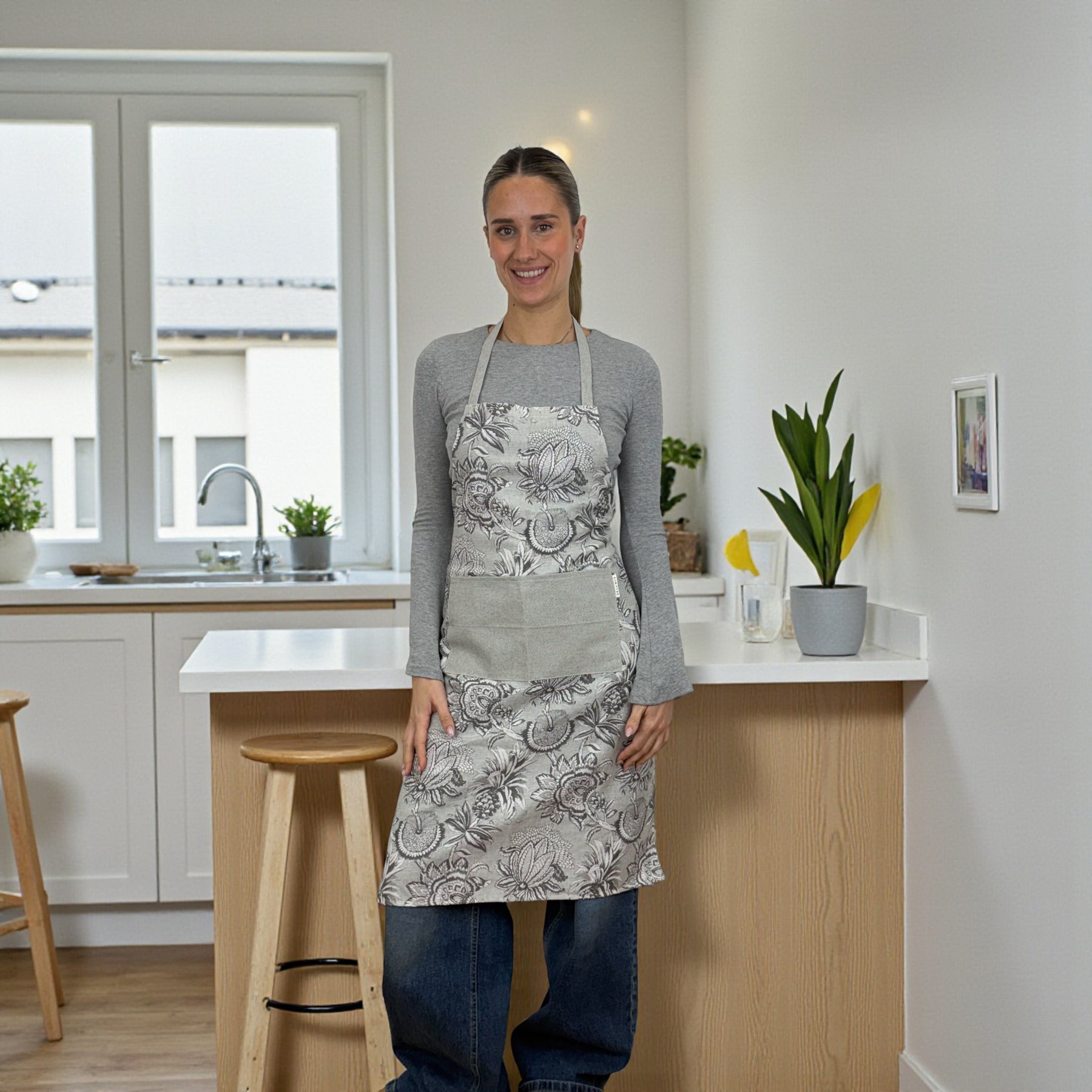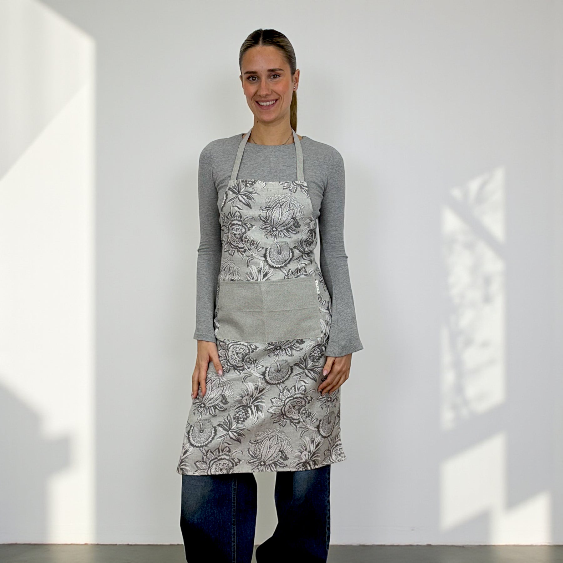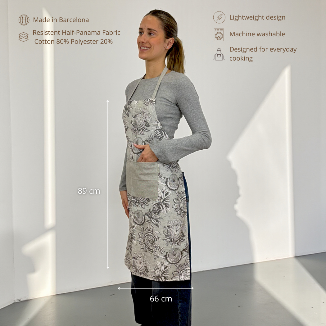 Delantal con bolsillo delantero, confeccionado en tejido fino de half-panama 80% algodón y 20% poliéster con estampado floral gris. El bolsillo en un tejido gris liso, que aporta contraste y un toque especial que lo hace aún más único.