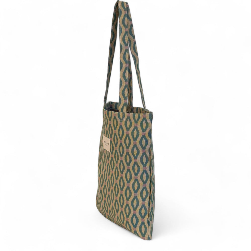 Bolsa "tote bag" con asas para llevar al hombro. Con tejido grueso de jacquard con estampado geométrico en tonos rosa y verde. Para su correcto mantenimiento se aconseja lavarlo en frío y no utilizar secadora.